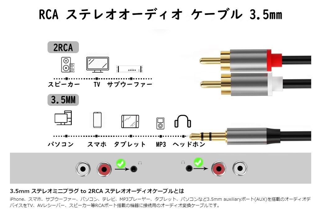 RCA ステレオオーディオ ケーブル 3.5mm ステレオミニプラグ→2RCA(赤/白) 変換(長さ:2M)