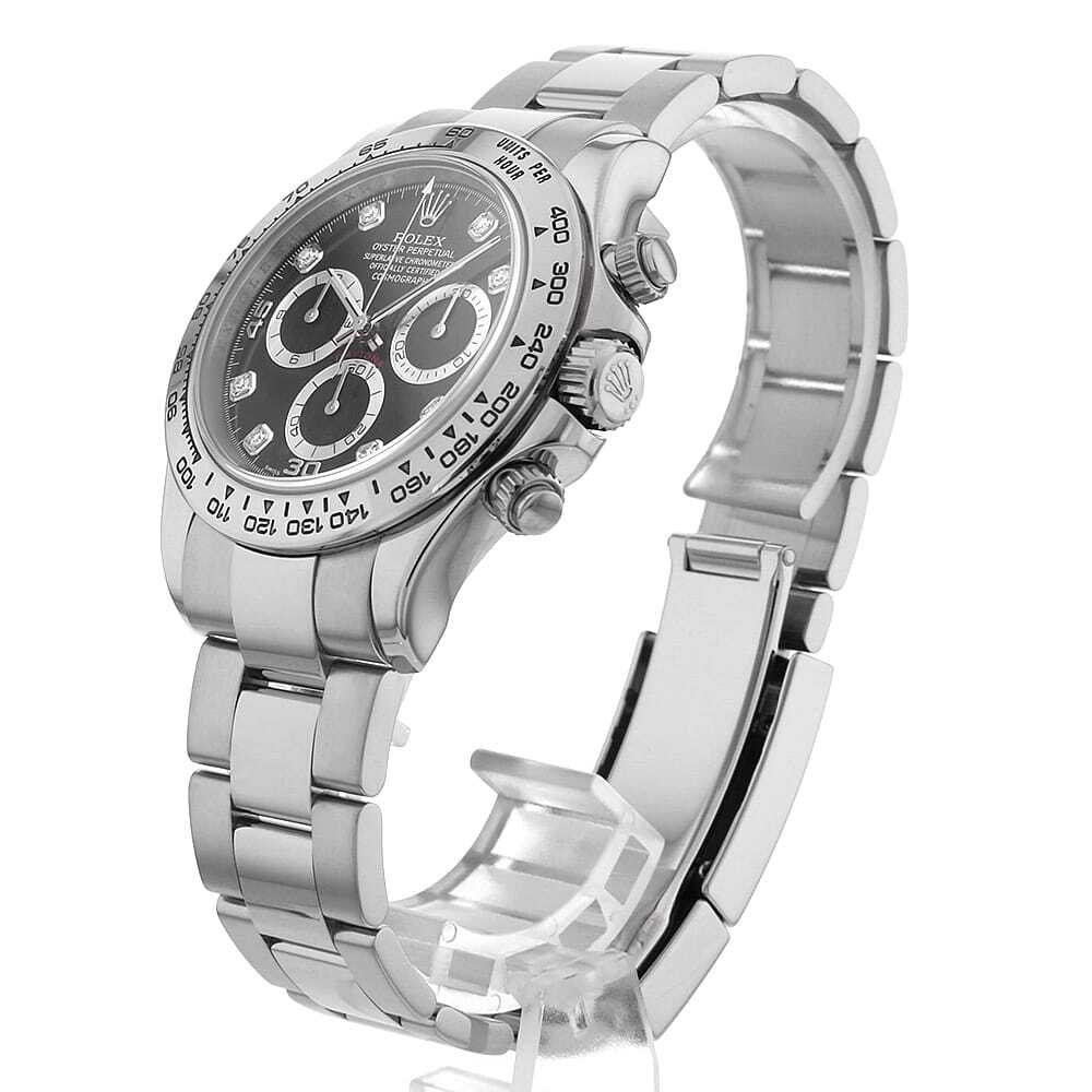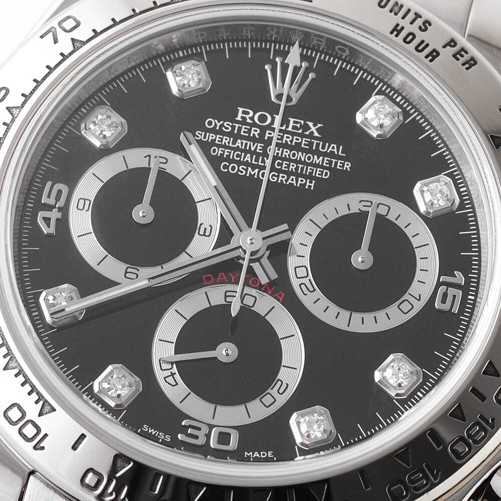 | モデル情報 | ロレックス・スポーツモデルの最上位機種であり最人気機種と言える"コスモグラフ デイトナ"。こちらのモデルは、インデックスに配された8粒のダイヤモンドの華やかさ、ホワイトゴールドのずっしりとした存在感を同時に味わえる非常にゴージャスなモデルです。 |