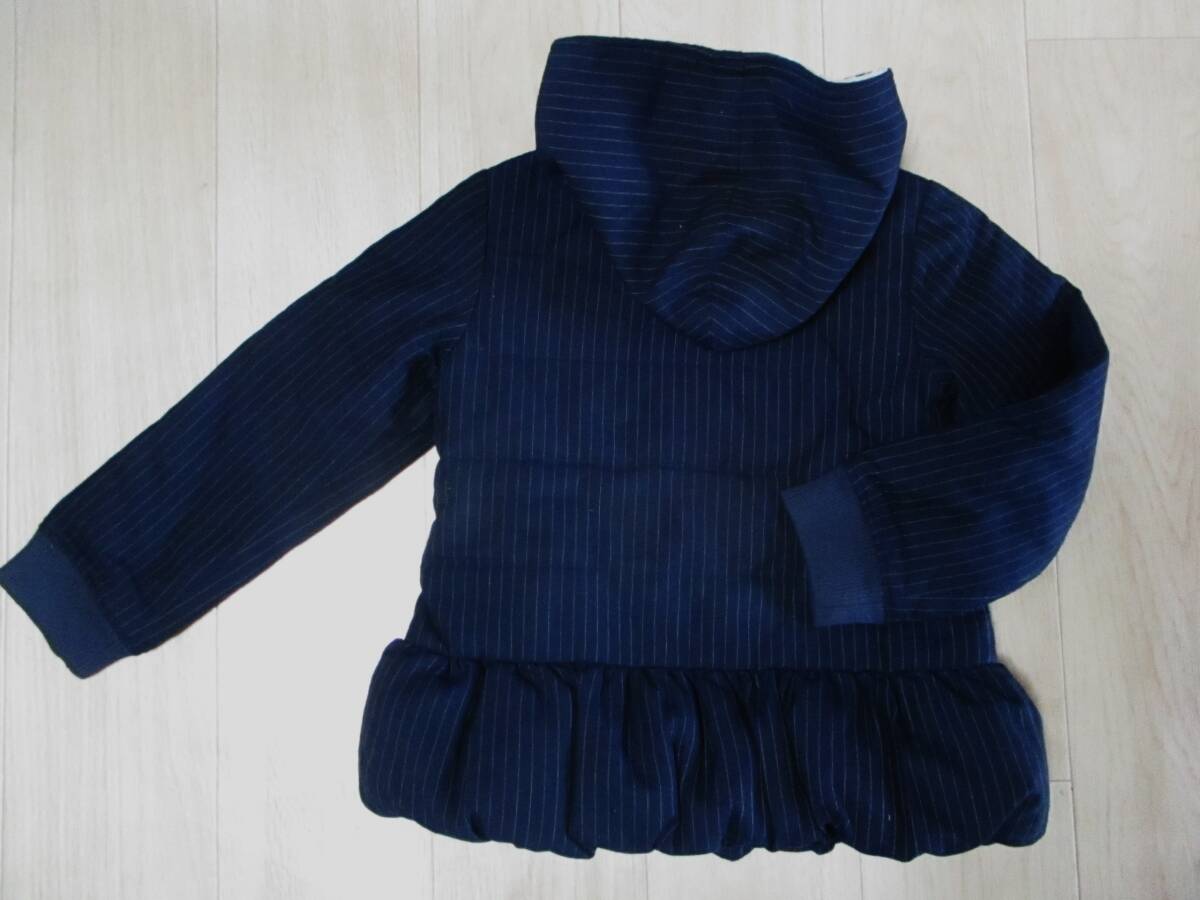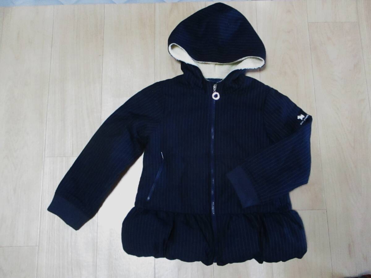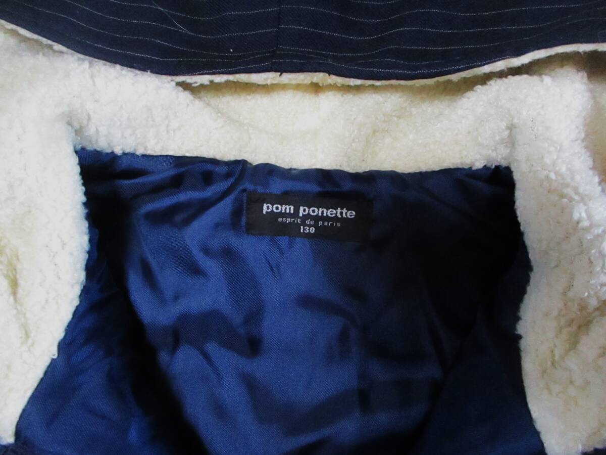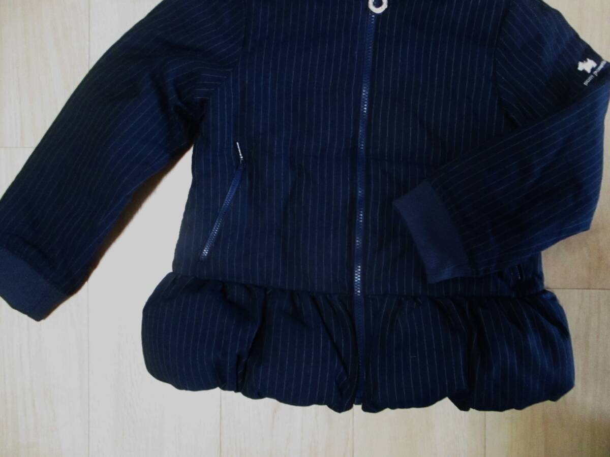 USED・美品・ポンポネット・可愛い中綿入りジャンパー・ストライプ・紺色・サイズ130㎝・着丈47㎝・身幅脇下36㎝・表地ポリエステル65%・レーヨン35%・中綿・裏地ポリエステル100%・レターパック600円で発送させて頂きます。