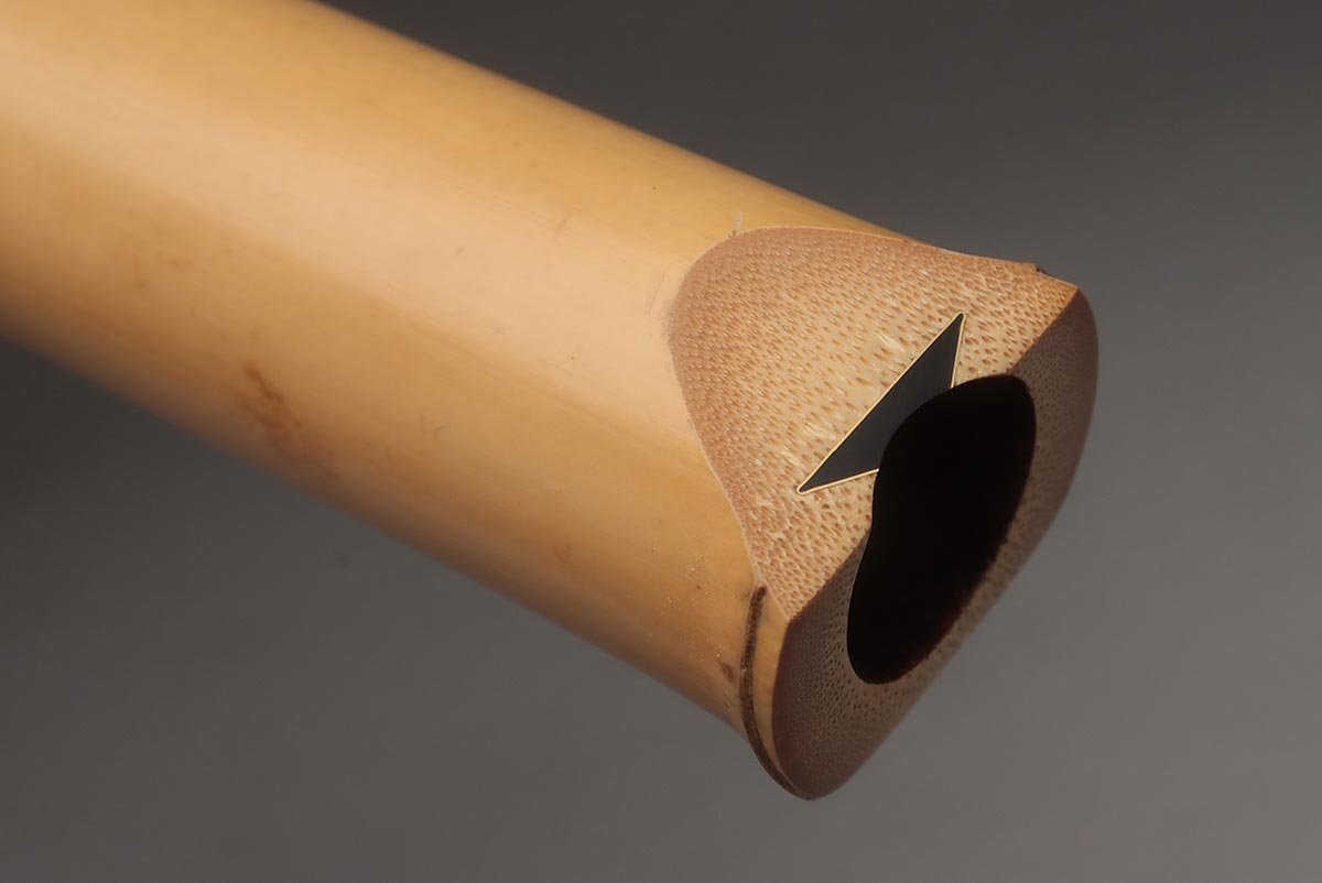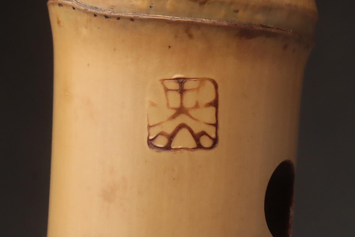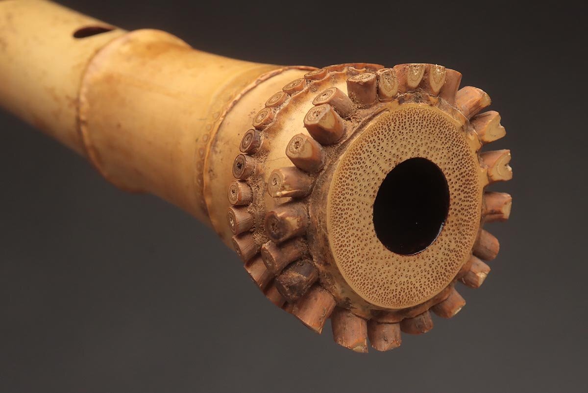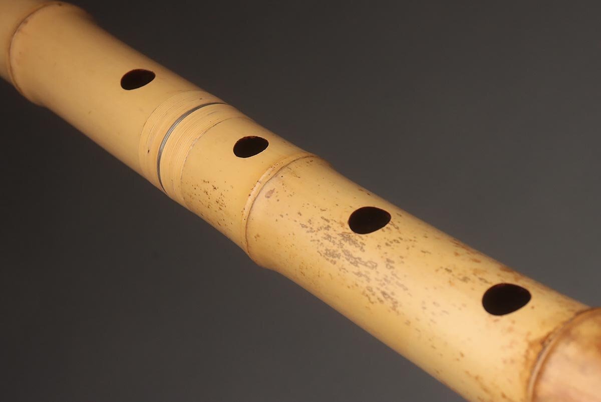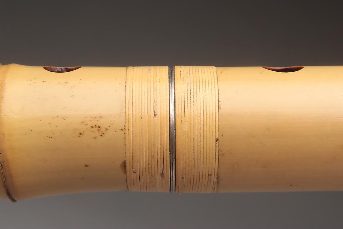 | ◆ 時代和楽器【石倉 央山 銘 二印】竹製 銀継ぎ目 琴山流 金巻歌口 尺八 全長54.5cm 重400g ハードケース/小物付・竹縦笛 ◆