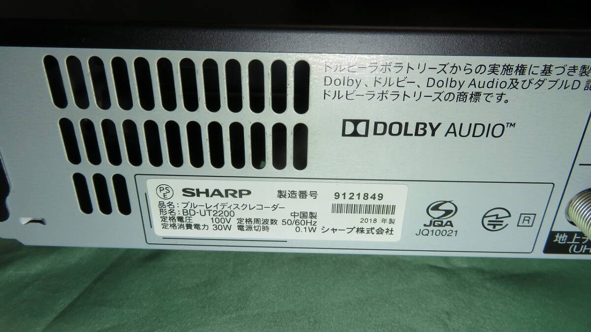 【twj08-1849】送料込、フロント扉無し★SHARP BD-UT2200 HDD 2TB/ 3番組同時録画 無線LAN内蔵/ リモコン付/ Ultra HDブルーレイ対応★