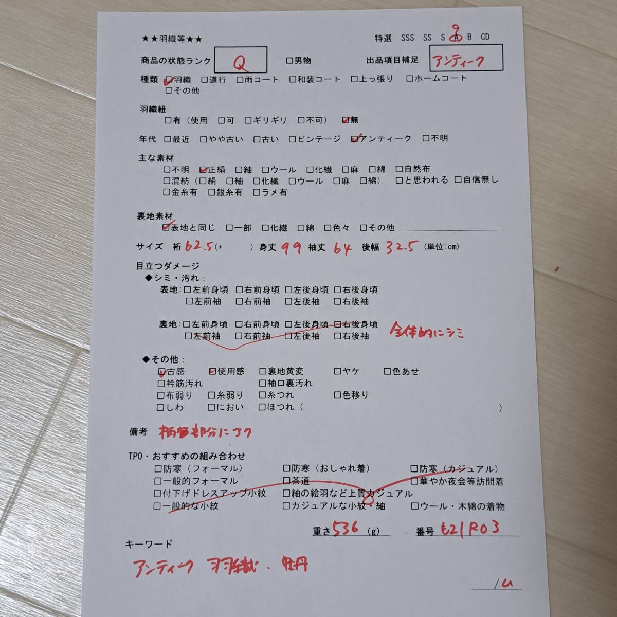 | Q★ | アンティークのお品です。基本的にお手入れ無しでは着用は出来ません。ハギレリメイク品として出品いたし ます。様々な難やシミなどございますので、古き物をご理解いただける方のみご入札ください。ノンクレームノンリターンでお願いいたします。 |
