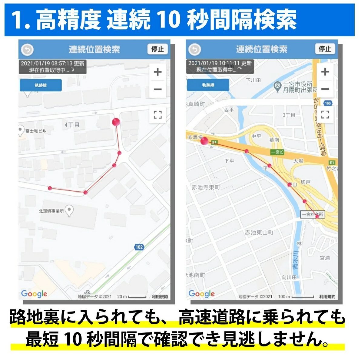 追跡したり、待ち合わせなどの場所を特定するための最短10秒間隔検索や、行動ルートや行動パターンを確認する為、移動ルートを地図上で見る機能もあります。