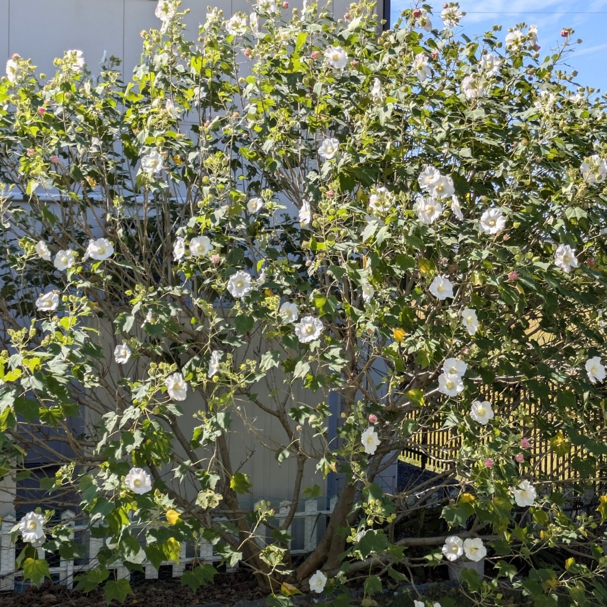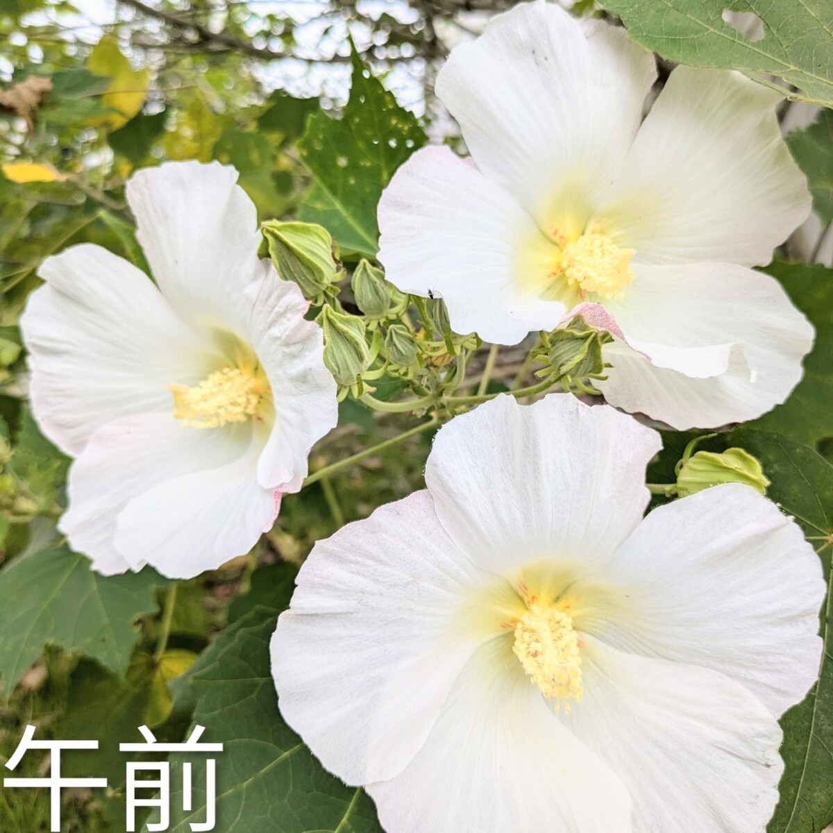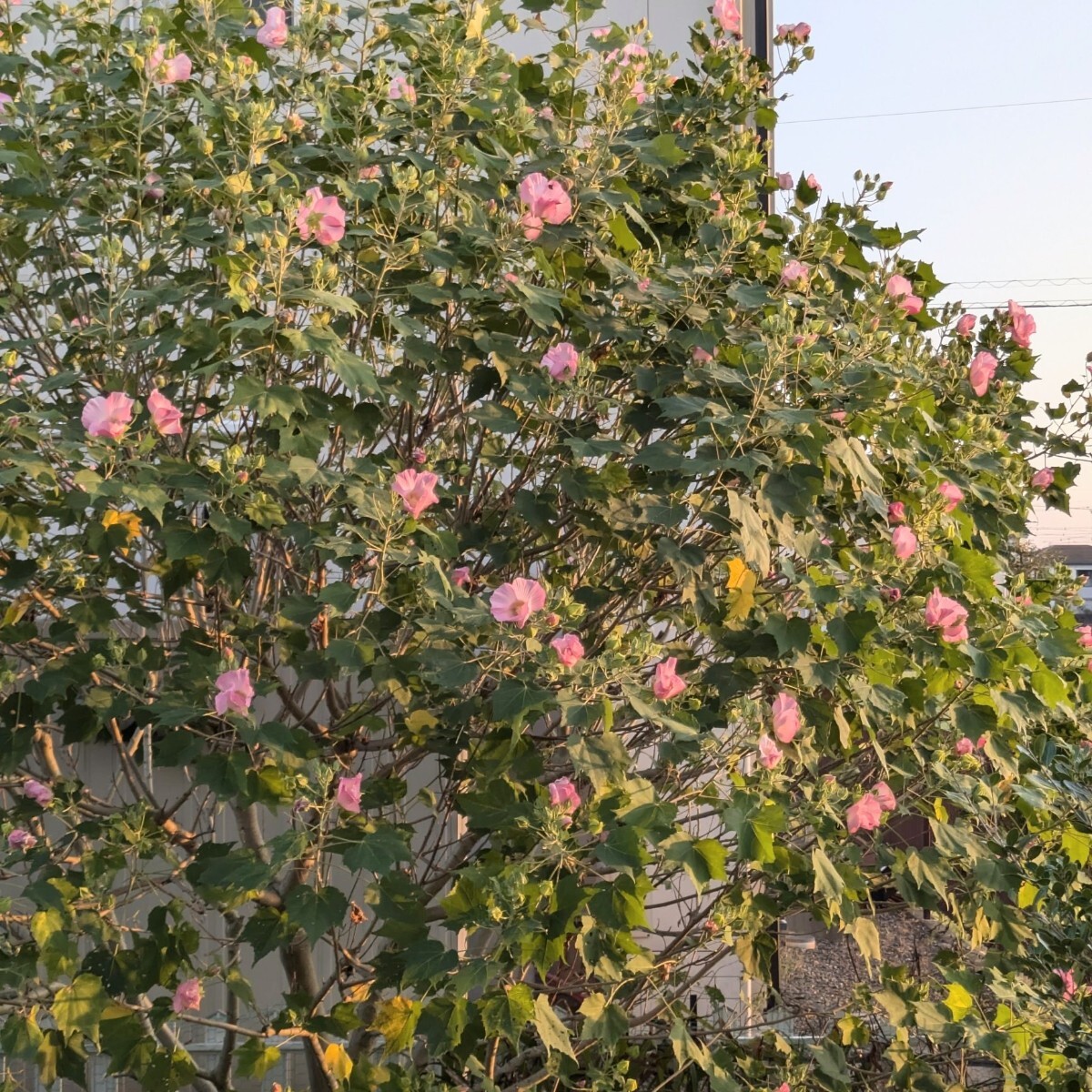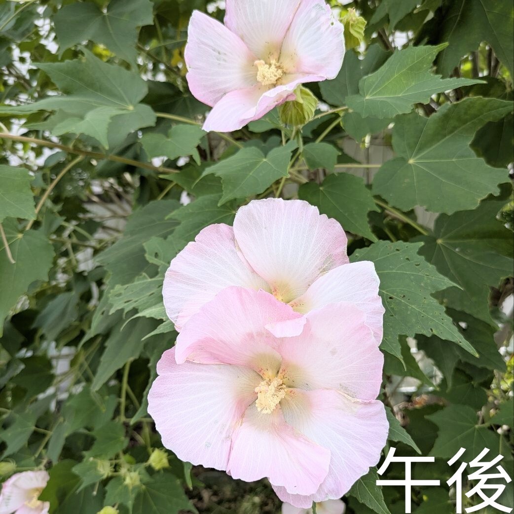 花びらの色が朝は白、昼はピンク、夜は赤く変わっていくことから、酒に酔って顔色が変わる様子に例えられ、「酔芙蓉」と名付けられました。とてもきれいです。