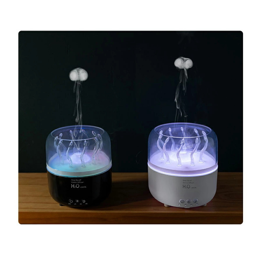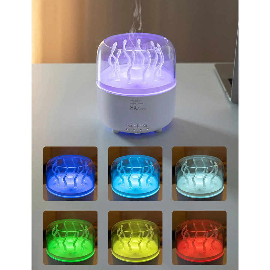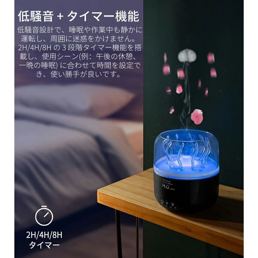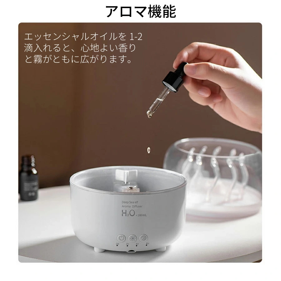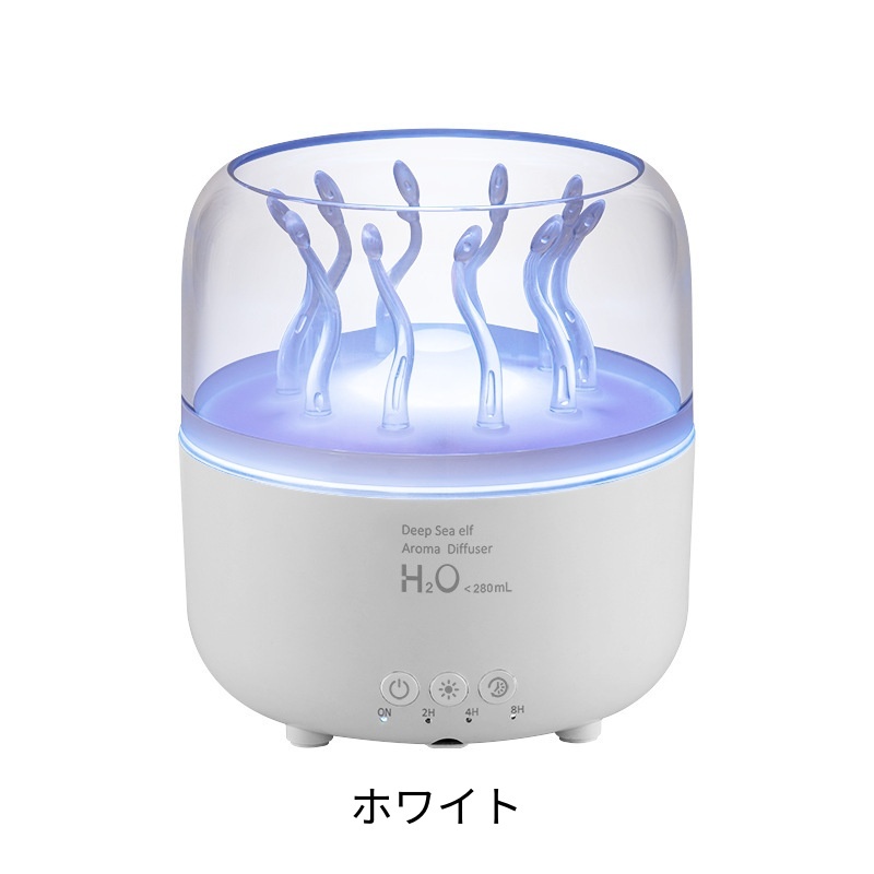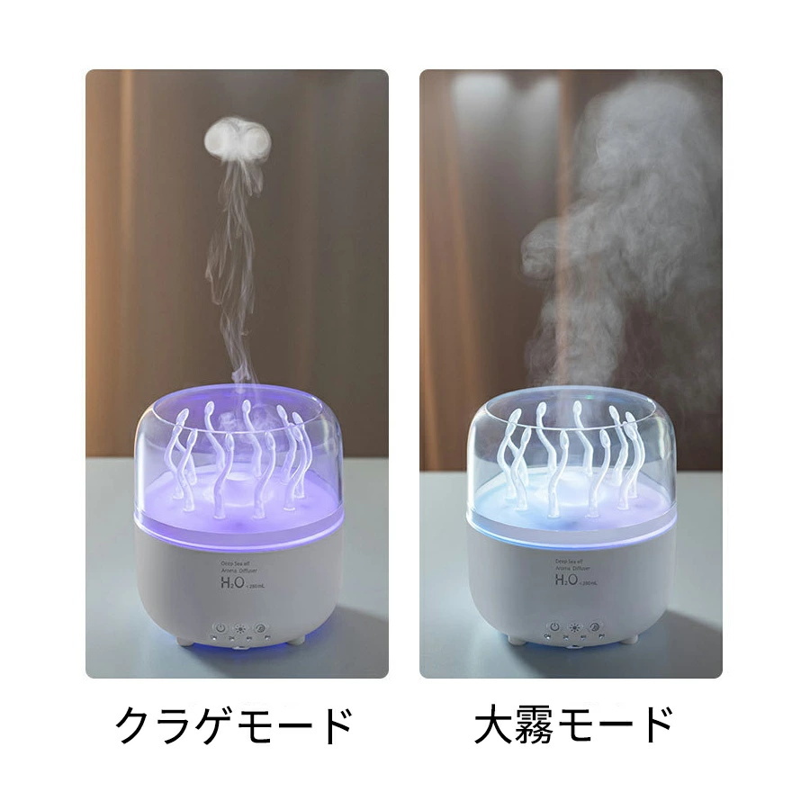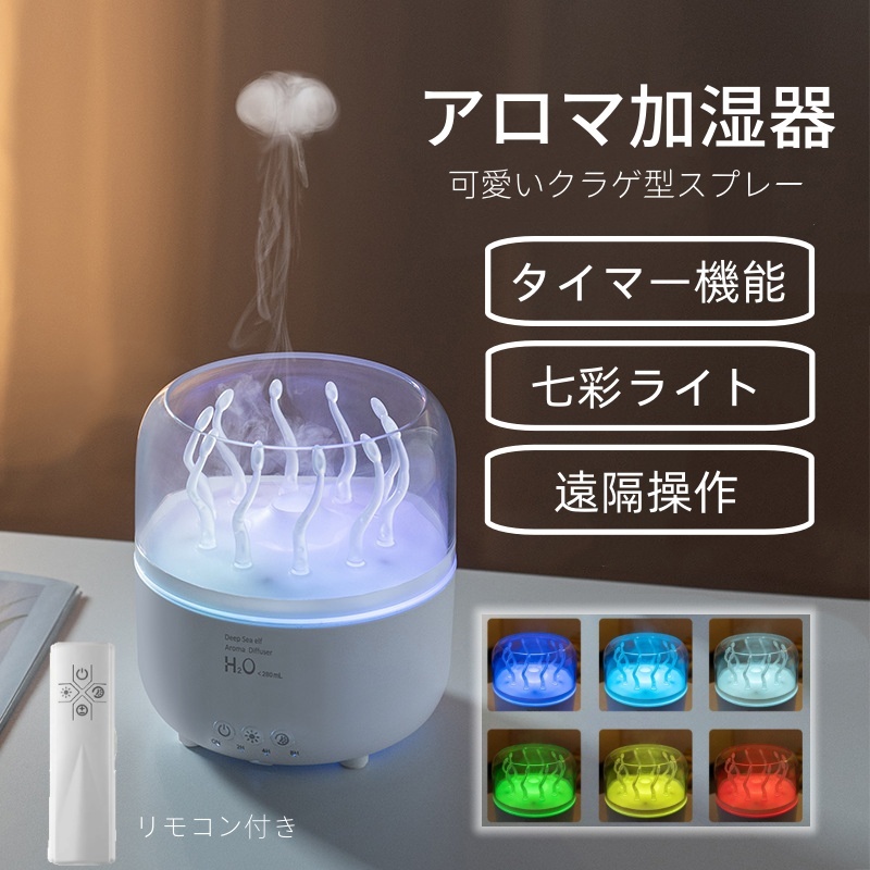 加湿器 小型 卓上 超音波 超静音 280ml大容量 車用加湿器 クラゲモード+大霧モード 七色のライトアロマ対応 2H/4H/8Hタイマー 静音 軽量