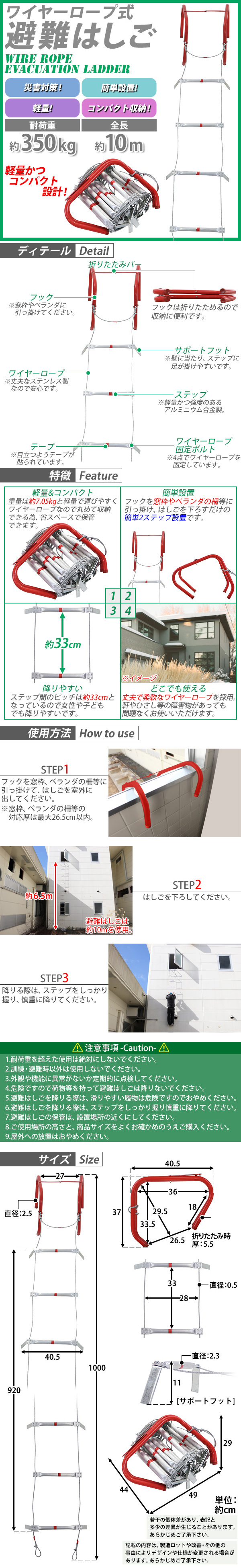 | 商品名 | 送料無料 避難はしご 折りたたみ 全長約10m 耐荷重約350kg 梯子 はしご 防災用品 防災グッズ 3階 もしもの時の 緊急避難はしご 避難用はしご 縄はしご 非常はしご 防災 フック ワイヤーロープ ワイヤー コンパクト ビル 家庭 緊急 災害 地震 火災 軽量 避難 hinanhashigo10m |