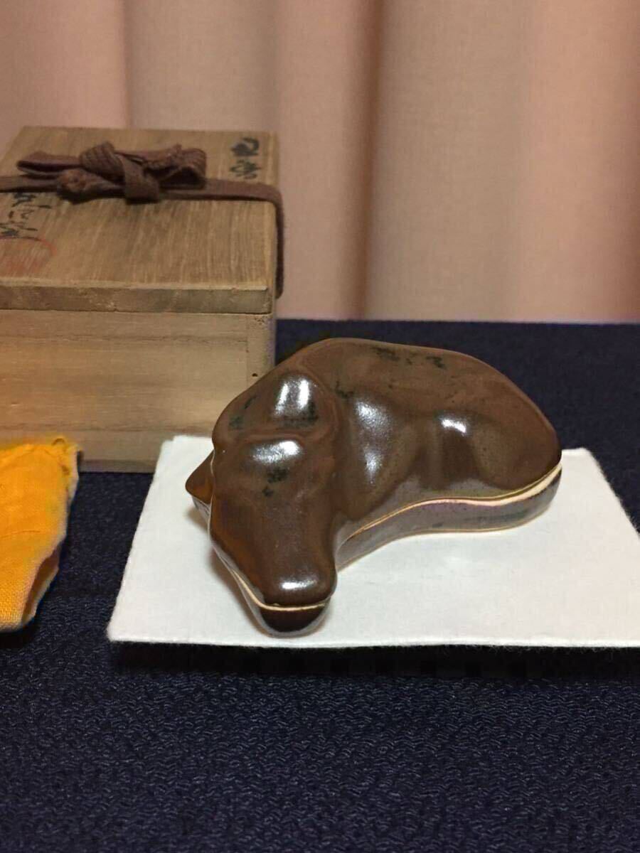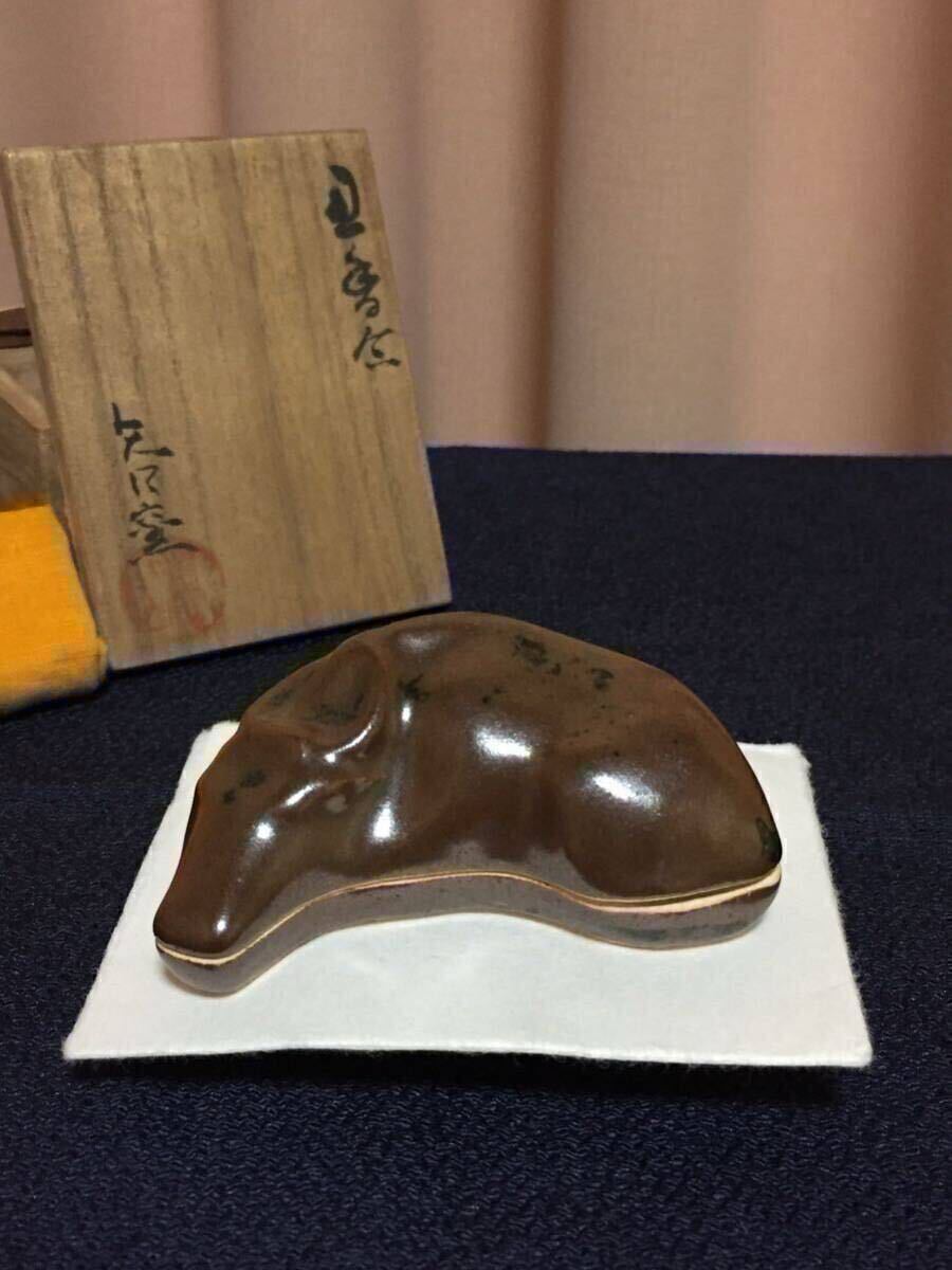 矢口窯 香合 干支 牛 丑 田中穂山 鉄釉 撫牛信仰 天神様 菅原道真 1938年以前か 美品 共箱 黄布 田中 穂山 作太郎 茂原市 大多喜天然ガス