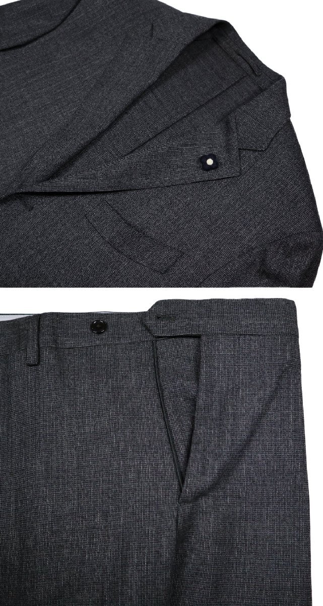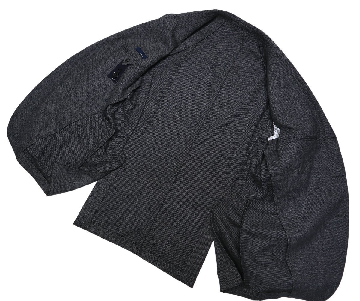 シングルブレスト段返り3ボタン 袖4ボタン(重ねの開き見せ仕様) 胸・バルカポケット 腰・フラップ付き玉縁ポケット シェル調デザインボタン 大見返し仕上げ 内ポケット2つ 額縁仕上げ ハンガーループ ブートニエール付き(着脱可能) 「MADE IN ITALY」タグ(内ポケット中) 一枚仕立て サイドベンツ