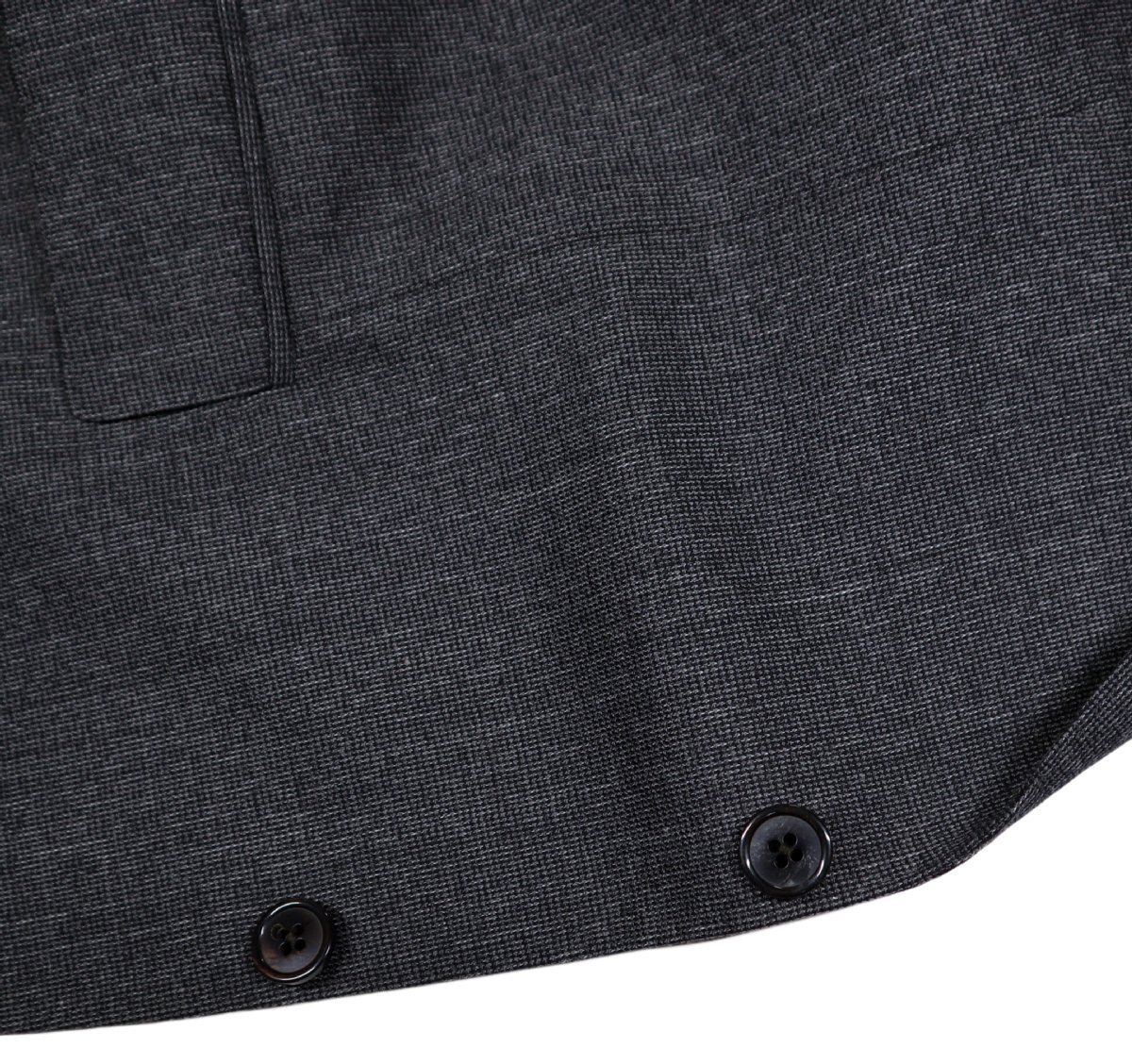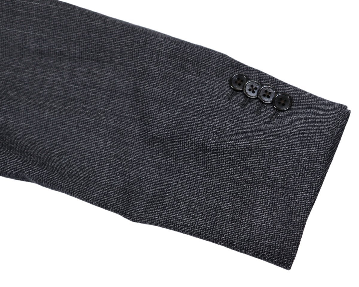 メランジ調チャコールグレー 上質なウールストレッチ素材を使用した、チャコールグレー色。ライトグレー、ミディアムグレー、ダークグレー(orブラック)の糸が織り交ざったメランジ調の織り柄になっています。ラペルには「ネイビー × オフホワイト」のステッチ入りブートニエールが付属し、洒落感と華やかさをプラスしてくれています!