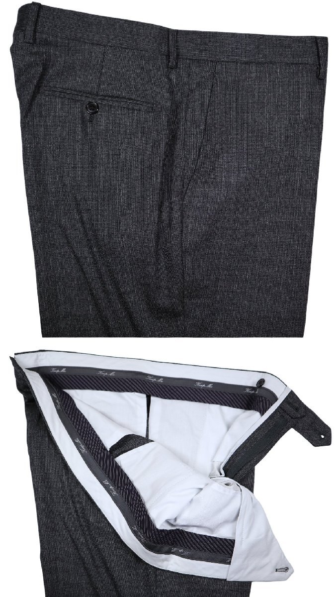 ノープリーツ ヒップ・1ダーツ&ボタン付き玉縁ポケット フォブポケット バックV字スリット 股シック布付き シェル調デザインボタン ライニングシャツ生地仕様 シャツ裾滑り止め機能 膝裏付き リボンパイピング かんぬき留め タブフロント 天狗 ジップフライ