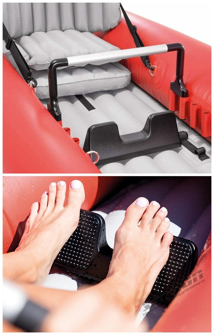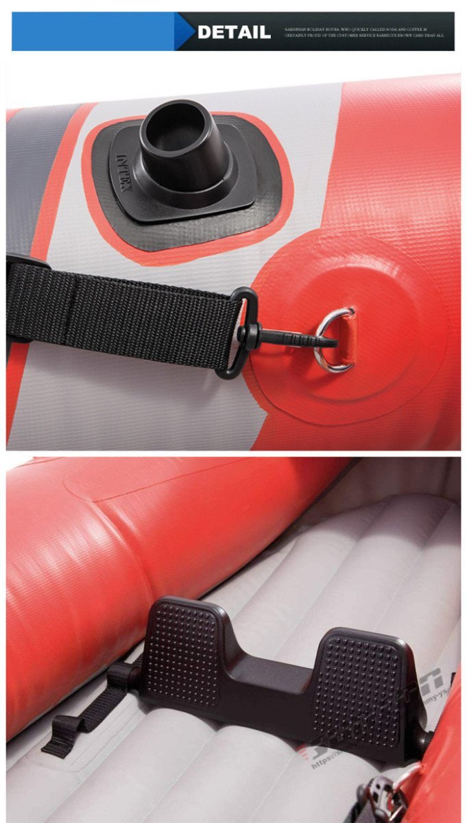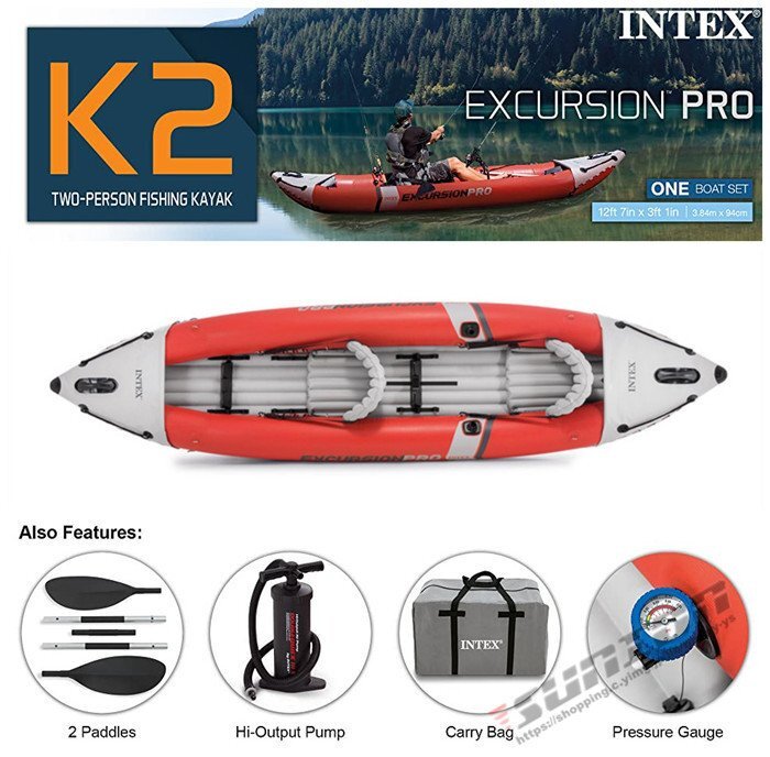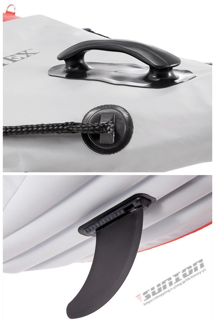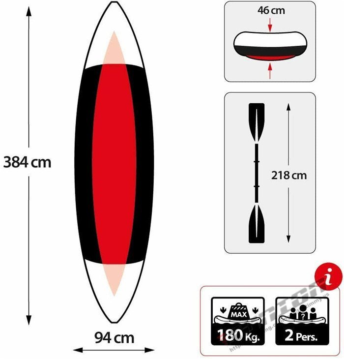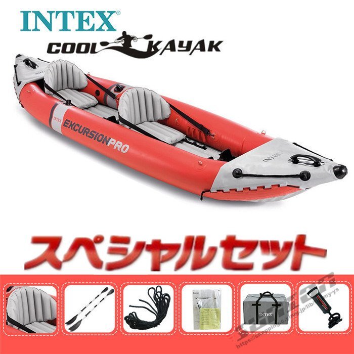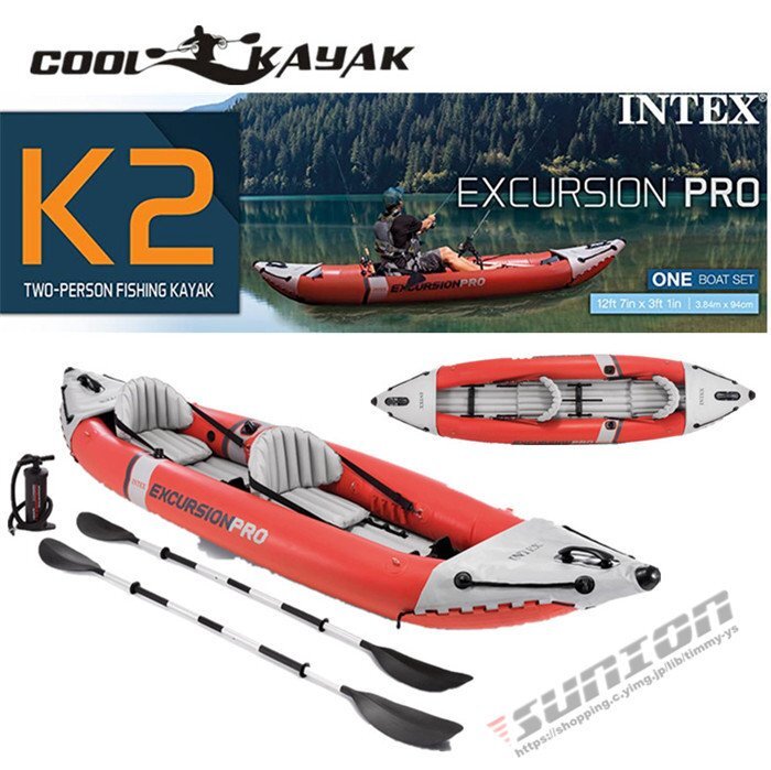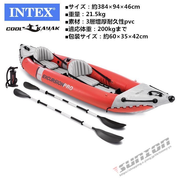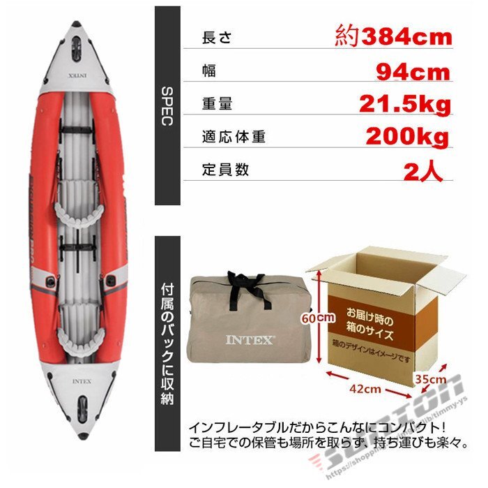 【商品SPEC】■サイズ:約384×94×46cm■重量:21.5kg■素材:3層増厚耐久性pvc■適応体重:200kgまで■包装サイズ:約60×35×42cm■セット内容:本体、バッグ、手動ポンプ、シート×2、パドル×2、フィン×1、修理キット×1●持ち運びや保管に便利な、2人乗りインフレータブル式カヤック。●カヤック本体とイスを膨らませて取り付けるだけの初心者に最適な簡単構造。●角度の調節できるインフレータブルシートにより数時間のパドリングも楽々。●フロアに設置されたドレンバルブにて船体に入った水を排出し、最適な量に調節することが可能です。