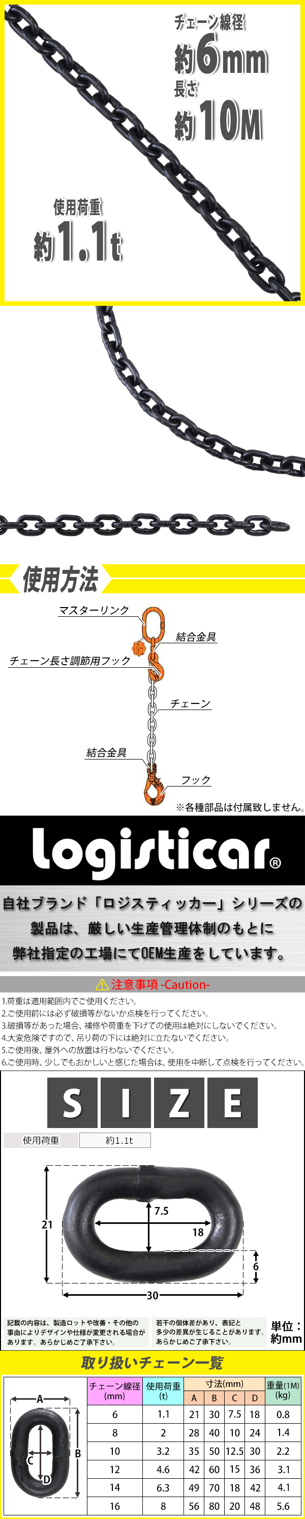 | 商品紹介 | ■こちらは約10mのチェーンです。 ■使用用途に合わせて自由にカスタム出来るチェーンです! ■様々な場面で大活躍! ■焼き入れを行うことで強度を増しています。 ■簡単接続。 ■シリーズでサイズ、メーターを豊富にご用意しております。 ※こちらは約10m×ご注文個数での発送商品となります。 ※チェーンのピッチにより、長さに多少の誤差が生じます。予めご了承ください。 ■重量:約8kg(10mあたり) ■基本使用荷重:約1.1t(1100kg) ■チェーン線径:約6mm ■材質:G80合金鋼(マンガン鋼)(本体) ●新品商品ではありますが、輸入商品の為、多少の擦り傷などがある場合がございますので、ご納得の上ご購入下さいませ。 ●ご購入後、お客様ご都合によるご返品、ご返金等は一切お受け致しておりません。 ●本商品を使用した際に発生したトラブル、事故につきまして、当社は一切の責任を負いません。ご使用に関しましては、全て自己責任にてお願い致します。 |