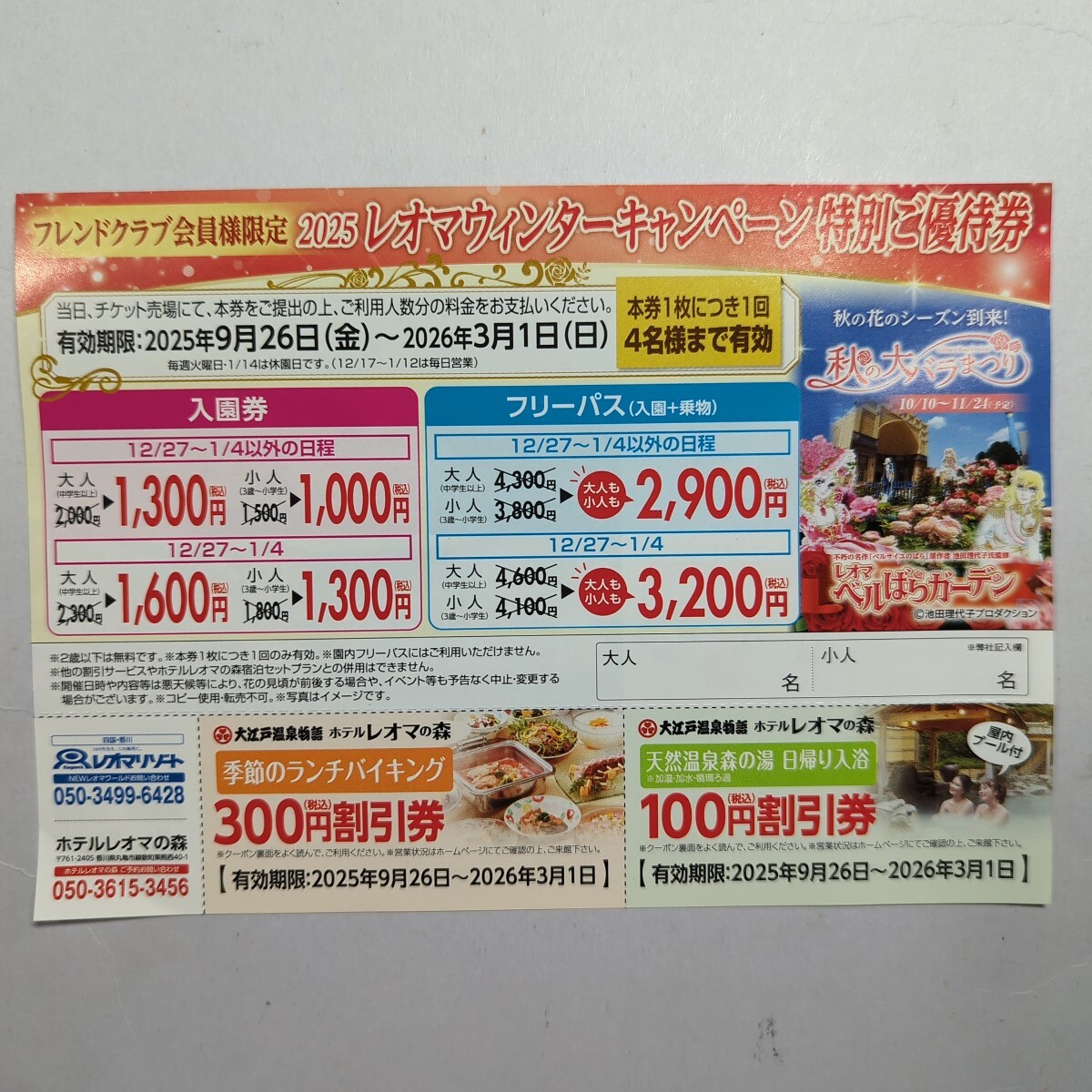 本券1枚につき1回4名様まで有効です。