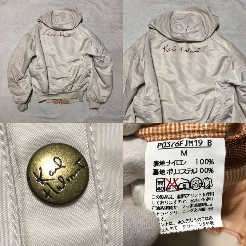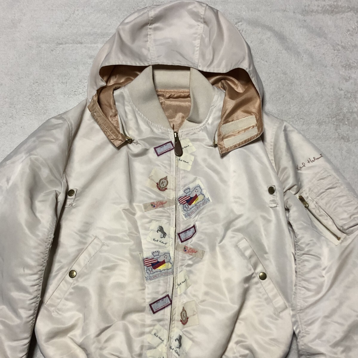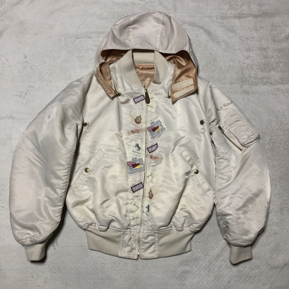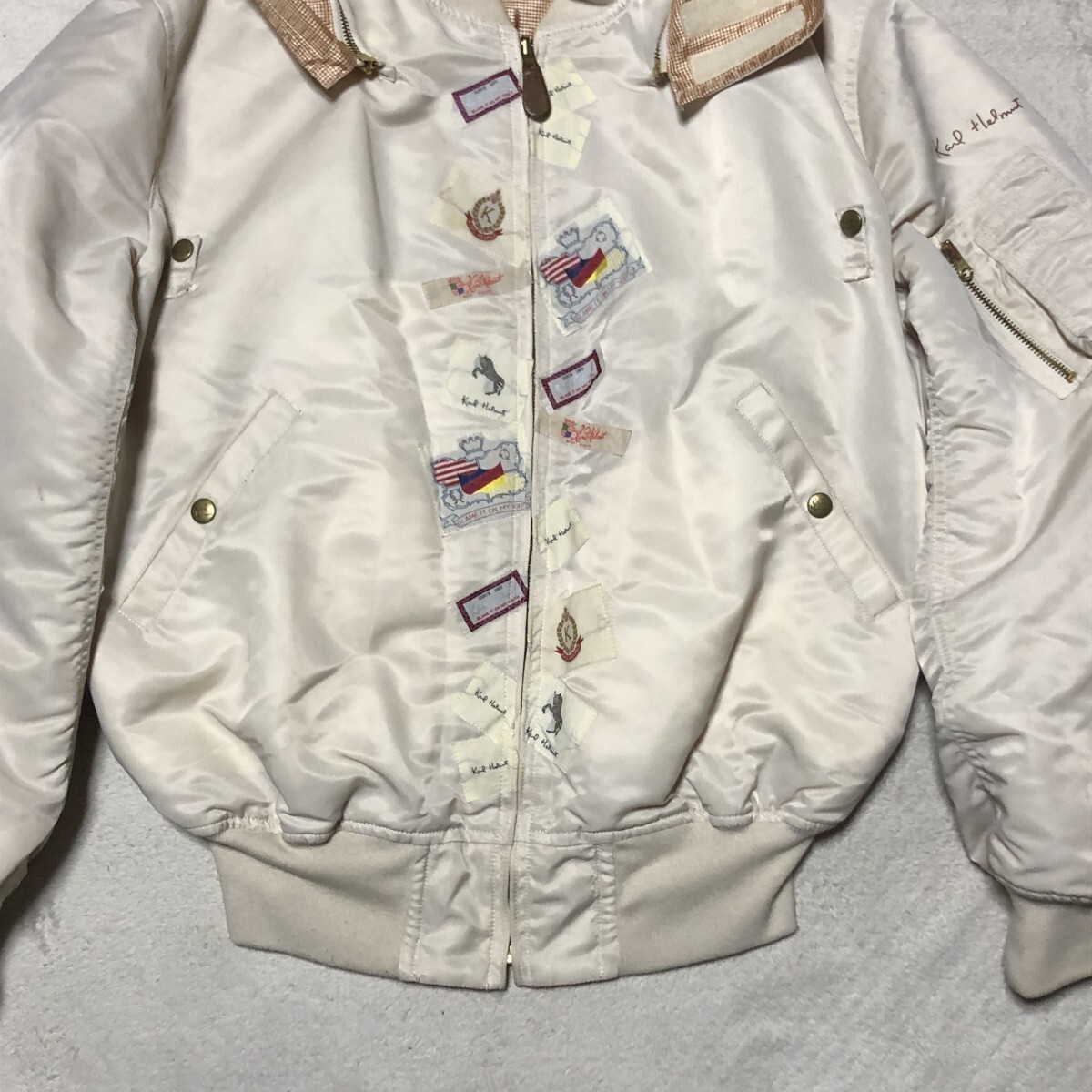 karl helmut カールヘルム ワッペンロゴ総柄 ロゴプリント MA-1タイプ 中綿ジャケット フライトジャケット 取り外し可能フード付き Mサイズ ピンクハウス