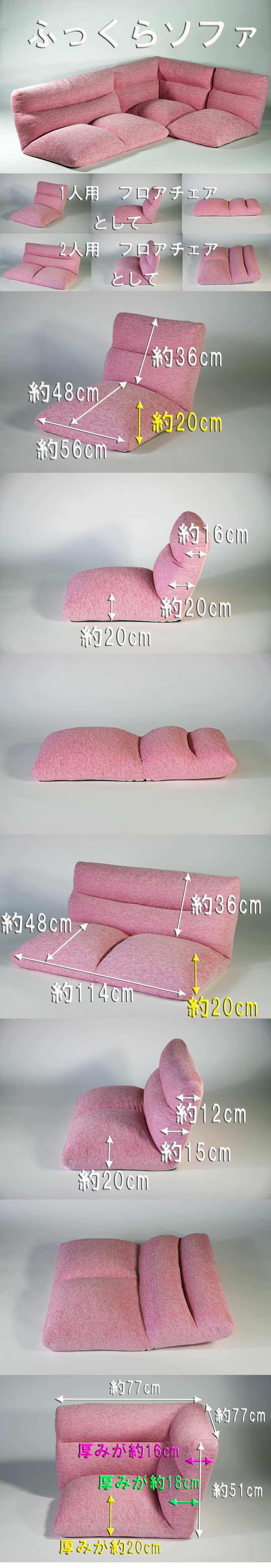 | 商品紹介 | ◆厚みが最大20cmもあり、ふっくらした座面で、ゆったりできるリビングフロアソファです。 ◆1人掛け、2人掛けとしても使用できそれぞれ6段階の角度調節可能で、お好みに合わせて作業しやすい体勢に調節できます。 (※L字のフロアソファは、リクライニングできません。) ◆もちろん、フロアベッドとしてもご利用できます。 |