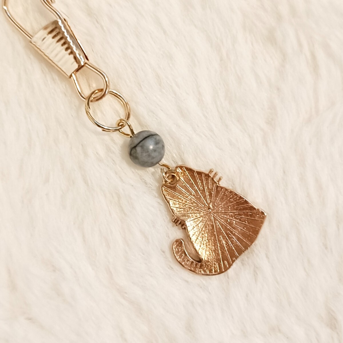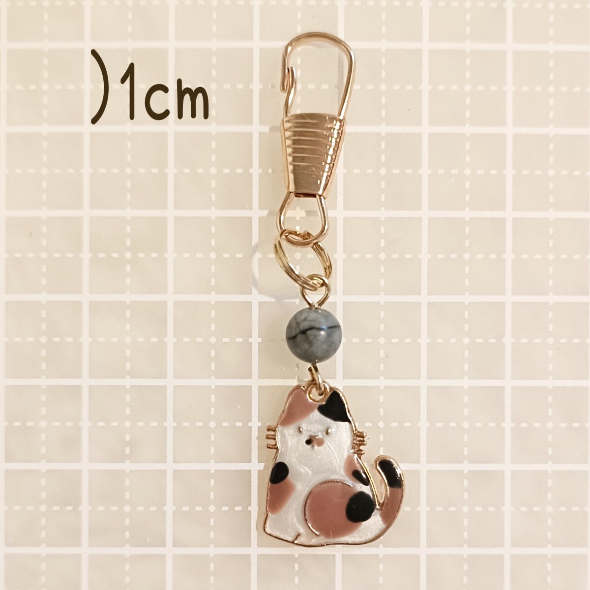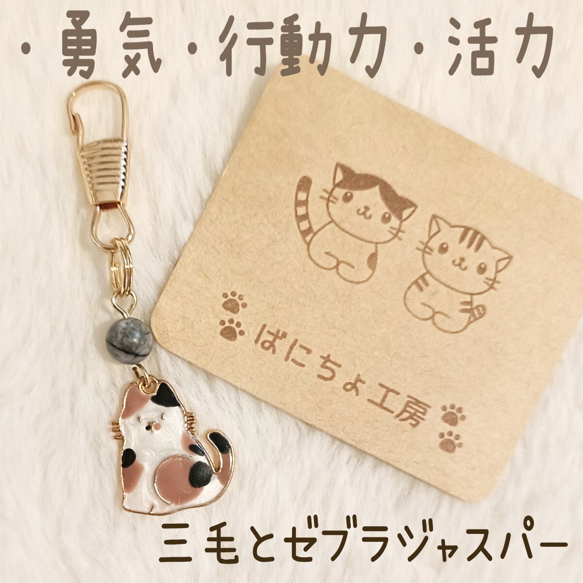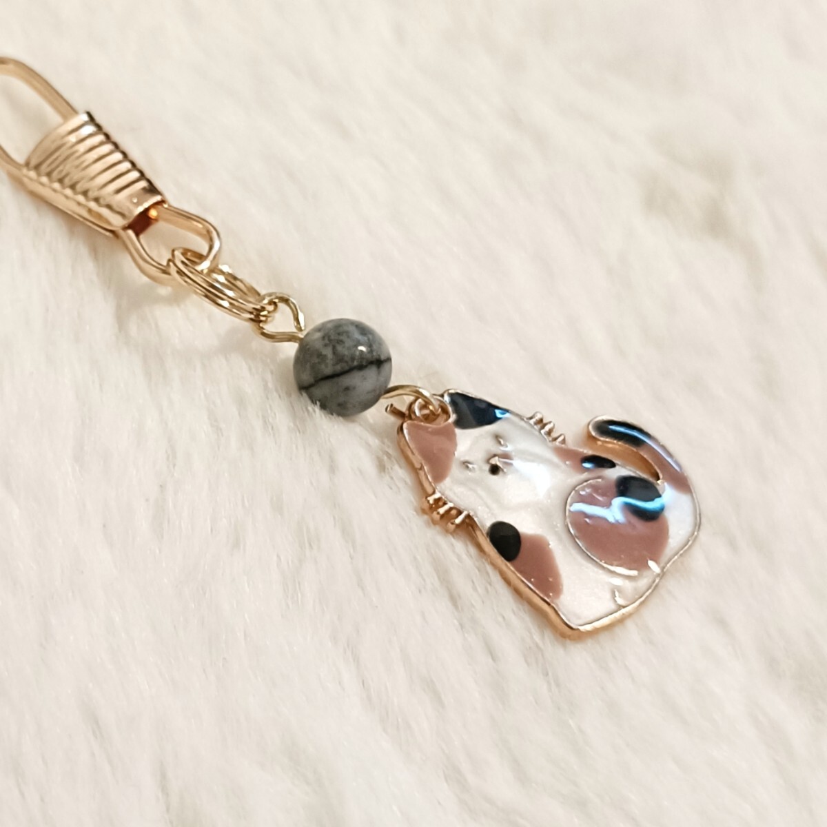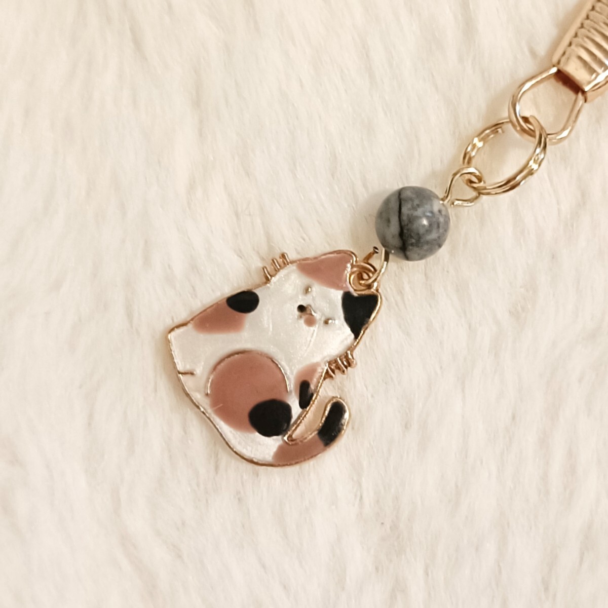 わが家のニャンコたちをイメージして描いたチャームにパワーストーンを添えたキーホルダーです(=^・^=)