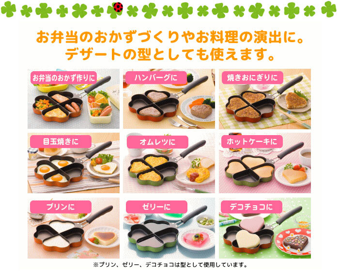 | ガス火専用。(※IHではお使いいただけません。) お料理の演出やデザート作りの方としても使えるフライパン。 忙しい朝もこのフライパンを使えば、1度に卵焼きやウィンナー、ハンバーグなどの4つの食材を同時に調理することができます。 ハート型になっているので、ハート型のオムレツやホットケーキなどいつもの料理もかわいく演出できます。 プリンなゼリーなどのデザート作りの型としてもご使用いただけます。 表面はフッ素樹脂加工を施してありますので、使用後のお手入れもラクラク。 ●IH対応もあります。 ※こちらのリンクは当店のヤフオク店のページへ進みます。 |