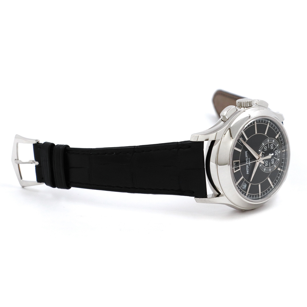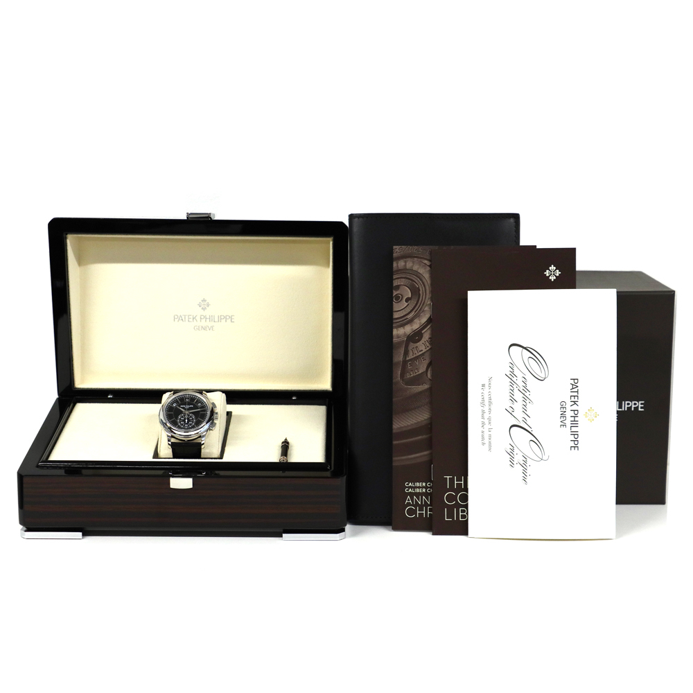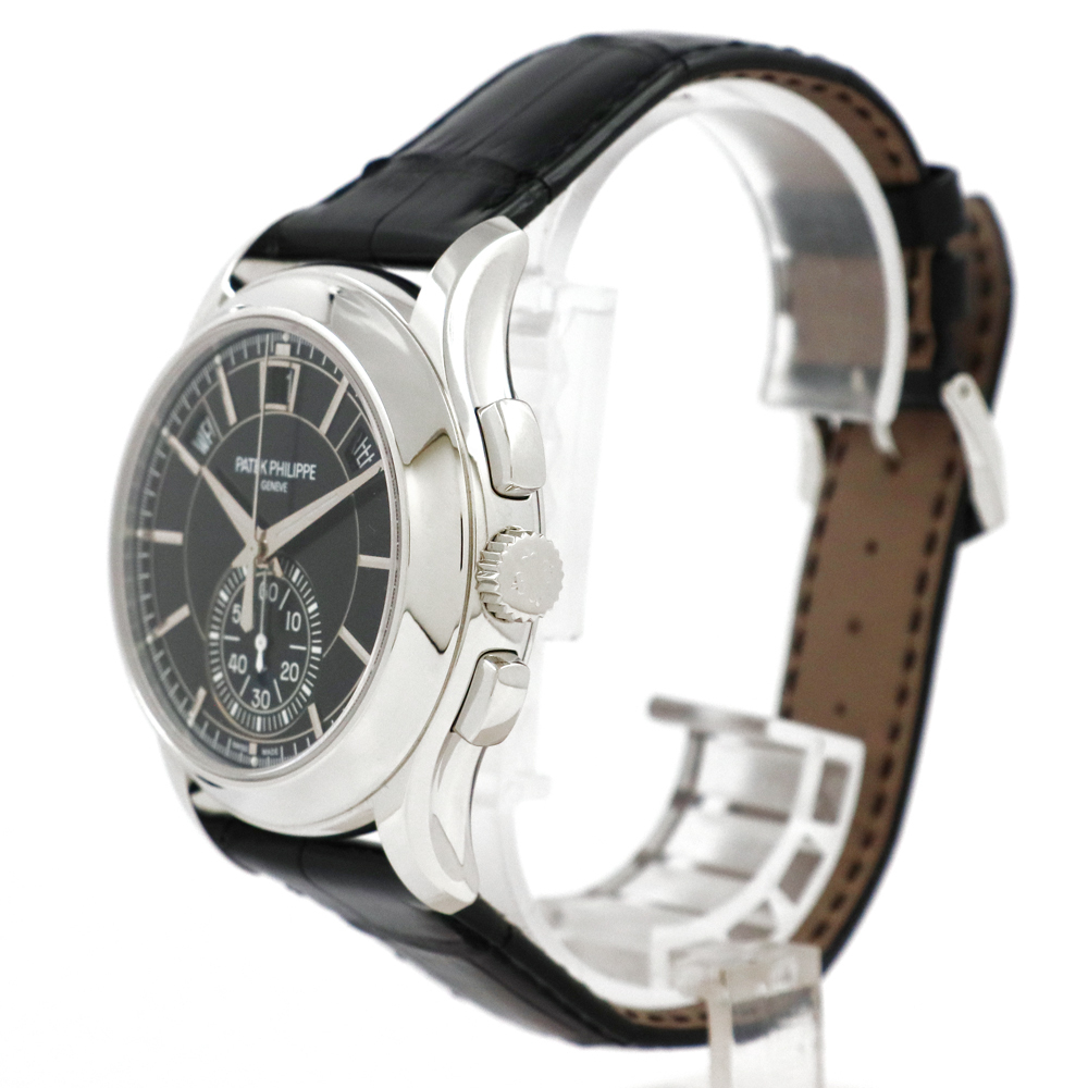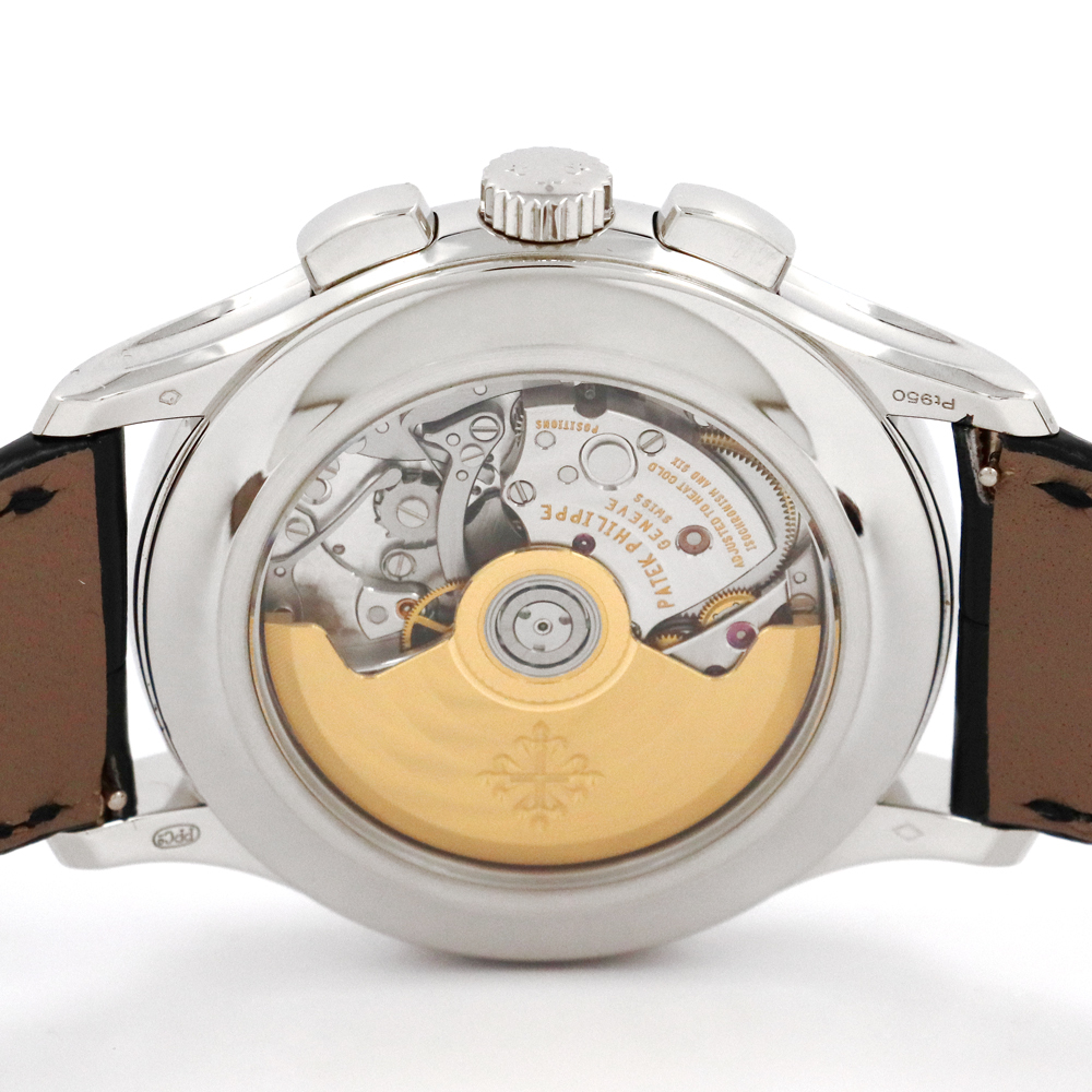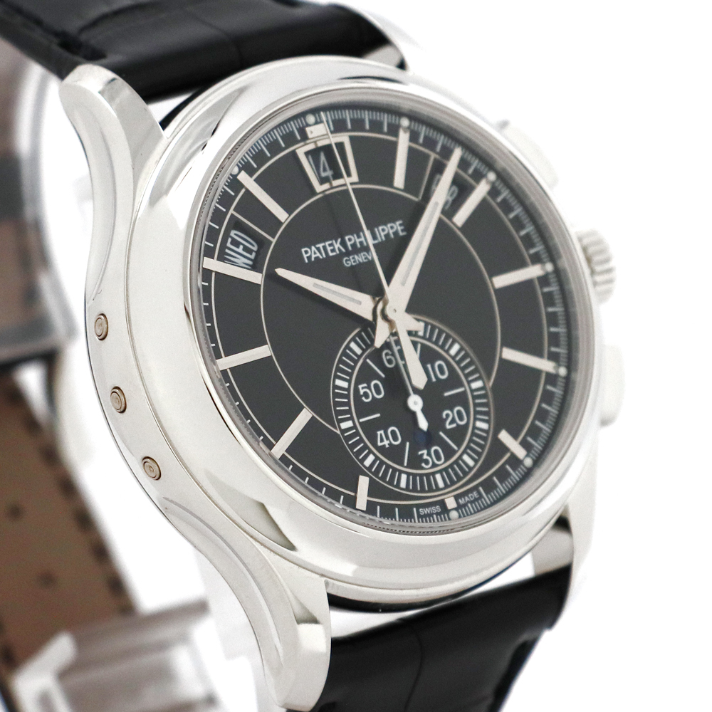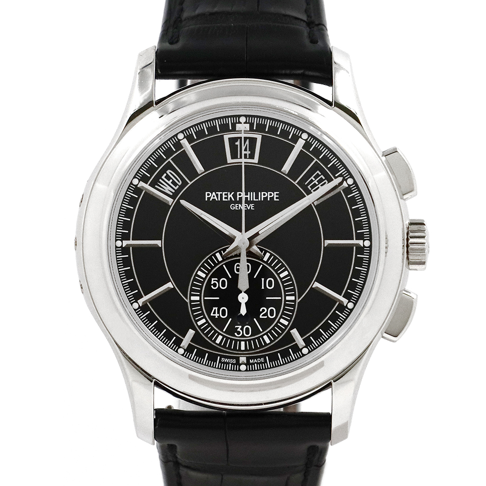 パテックフィリップ コンプリケーション アニュアルカレンダー クロノグラフ 5905P-010です。ケース素材にはプラチナを使用。搭載されている年次カレンダー(アニュアルカレンダー)はパテックフィリップが約4年もの月日を費やし、1996年に特許を取得した複雑機構。1年に1回(2月以外)調整するだけで、毎日の日付、曜日、月名を自動表示してくれます。シースルーバックからはそのムーブメントの動きを心ゆくまでお楽しみになれるでしょう。全体的にブラックカラーで統一されたシックな雰囲気の中に洗練された高級感を与えてくれる仕上がりとなっております。世界最高の高級時計ブランドの技術が結集された逸品を是非この機会にご堪能下さい。