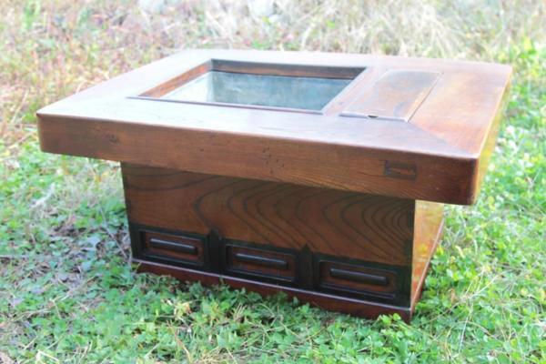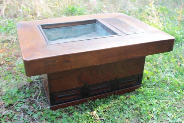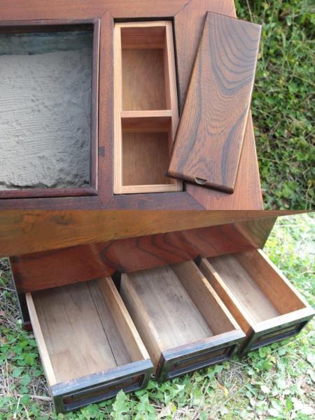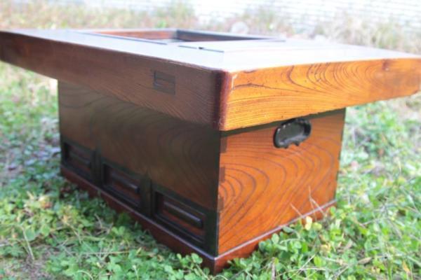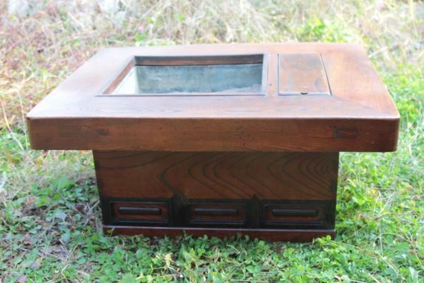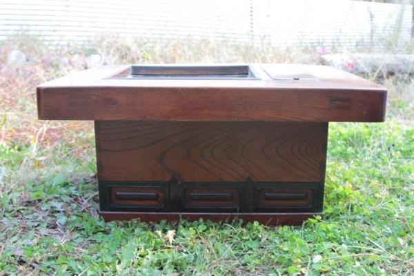 一か所、中引出しに少し開きあり。しっかりとした火鉢で状態良好です。横71.5cm、縦54cm、高さ34.5cm。天板厚み7cm。ノークレーム、ノーリターンでお願い致します。この他にも出品しておりますのでご覧下さい。ここをクリック