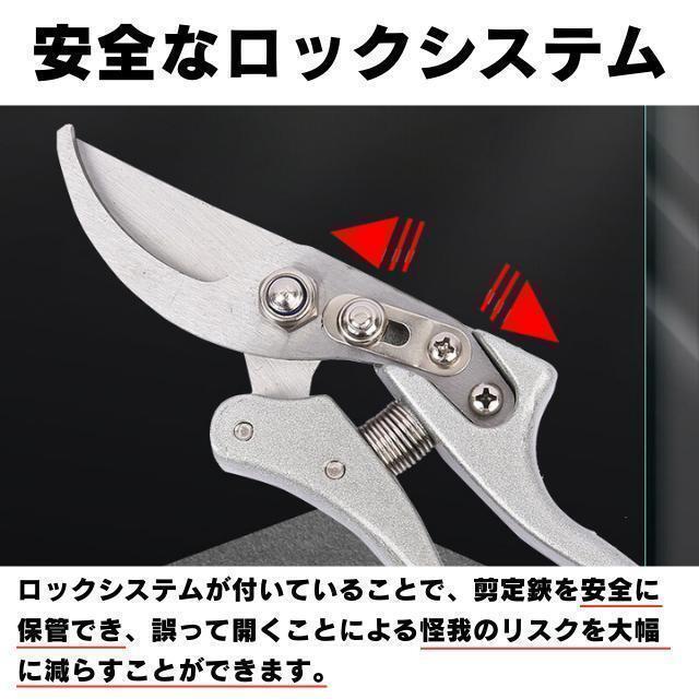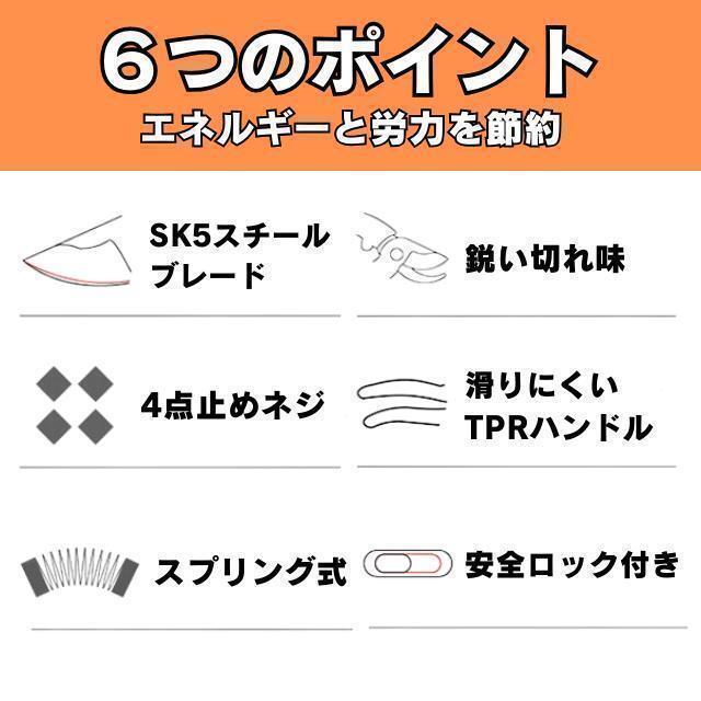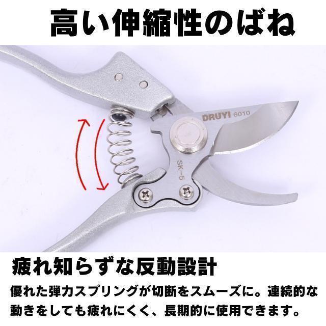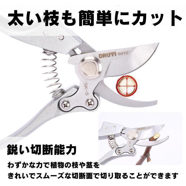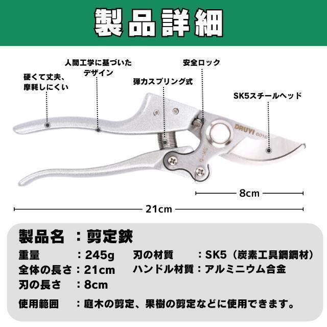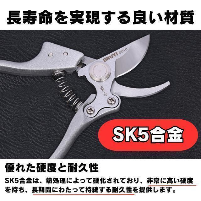 これは、プロフェッショナルな庭師や家庭菜園愛好者に最適な高品質の剪定鋏です。SK5合金を熱処理により鍛造・焼入れしたこの剪定鋏は、優れた硬度と耐久性を提供し、長期間にわたって使用することができます。さらに、安全で簡単にロックオン/オフができるロックシステムを備えており、使用時と保管時の安全を確保します。
