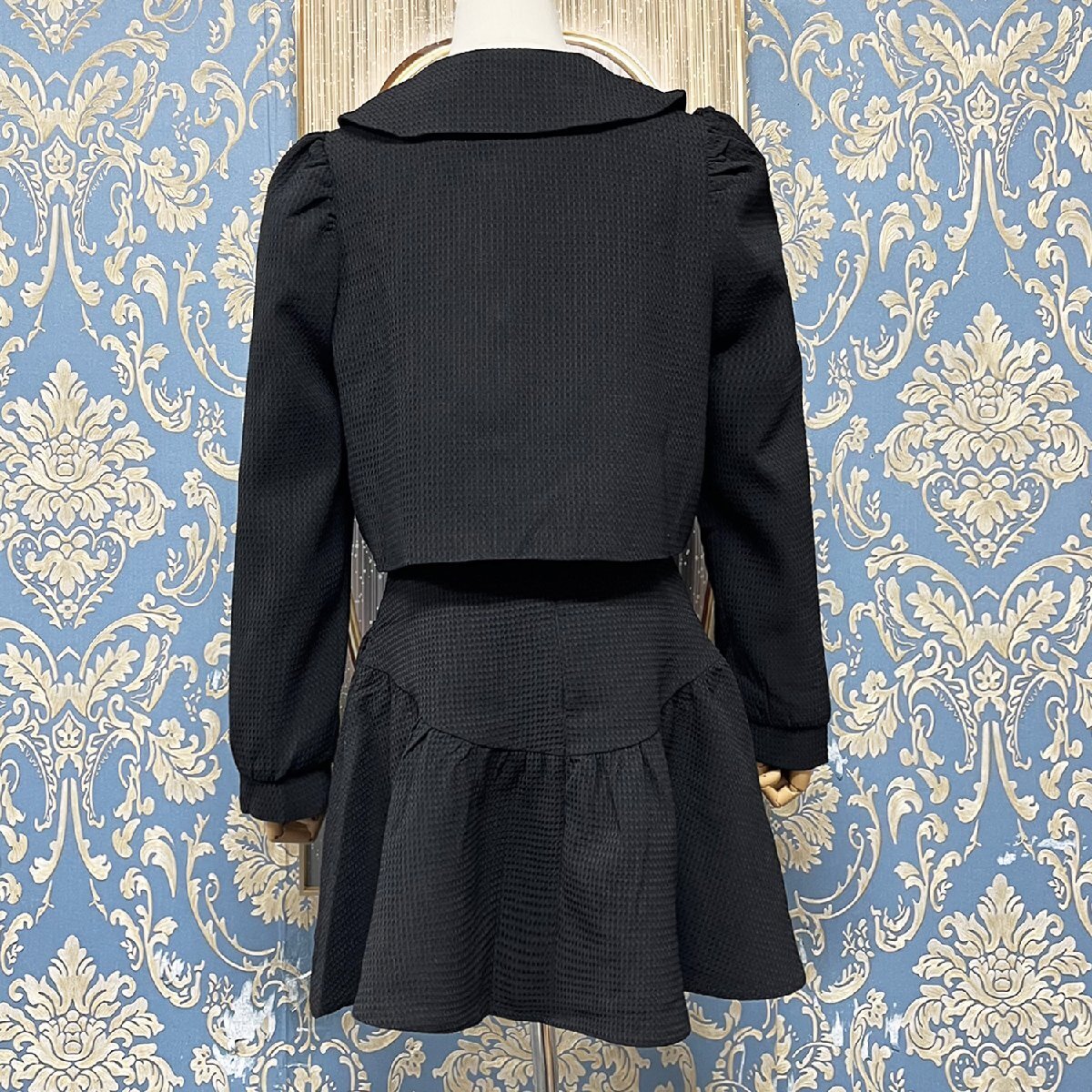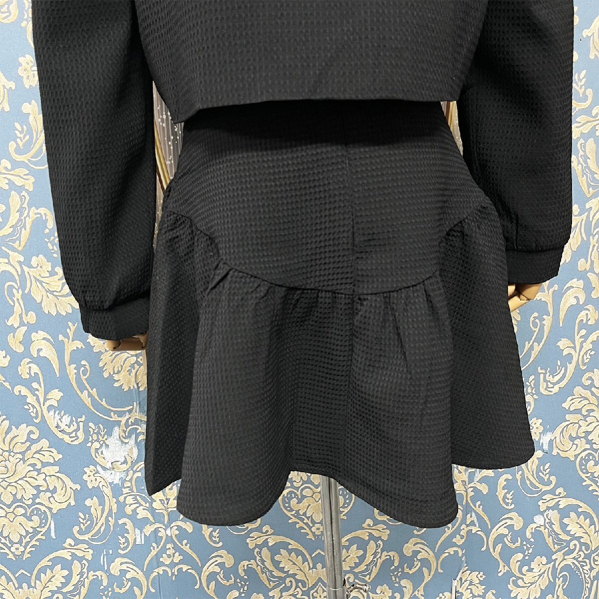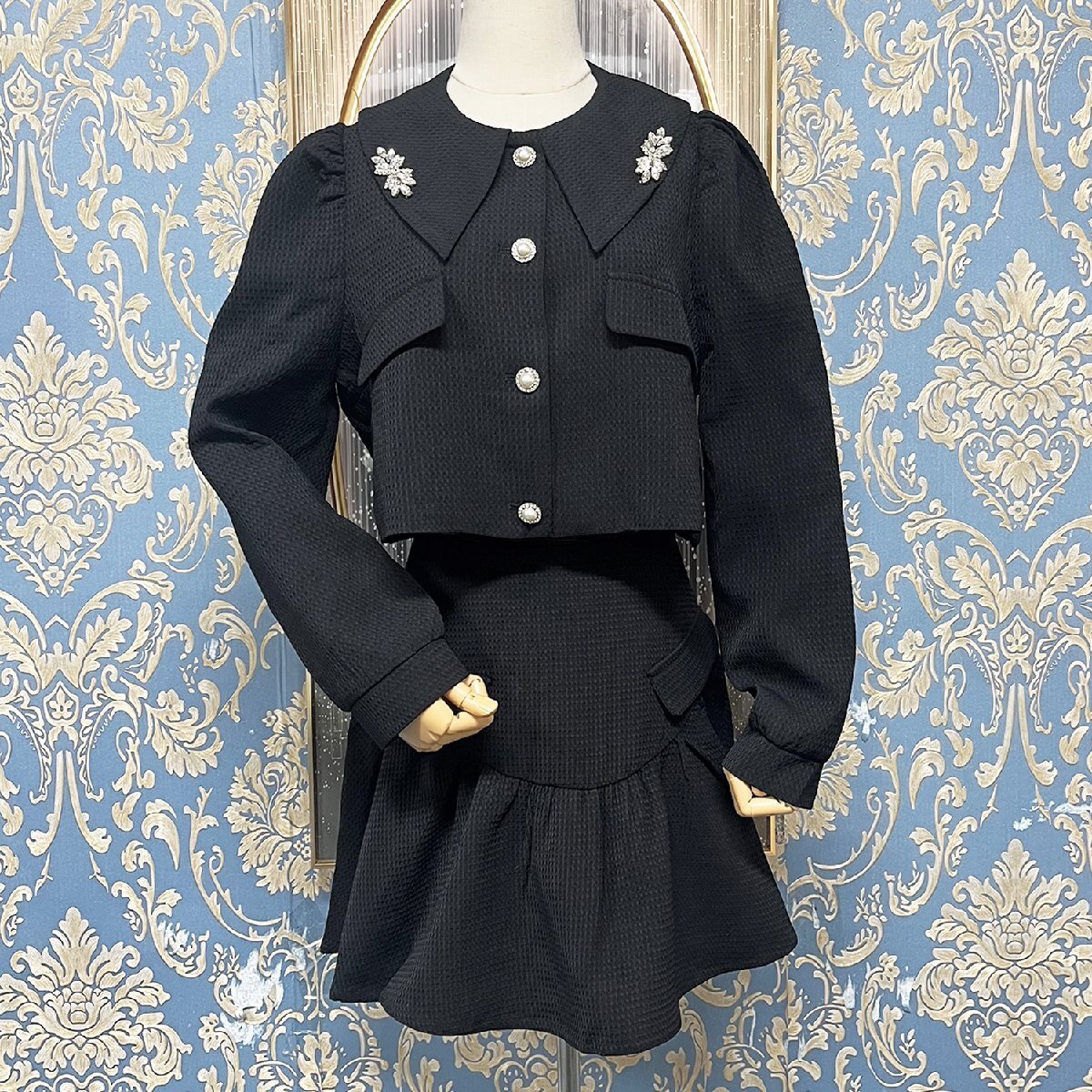 トレンド感のある着こなしを手軽に楽しめるショートジャケットとショートスカートのセットです。