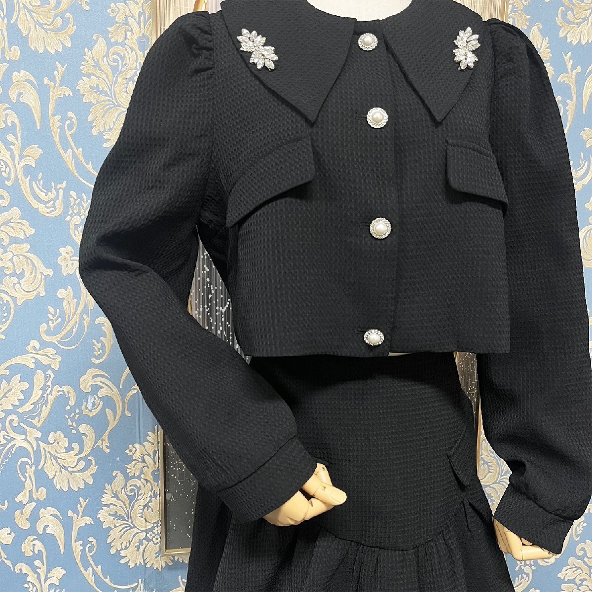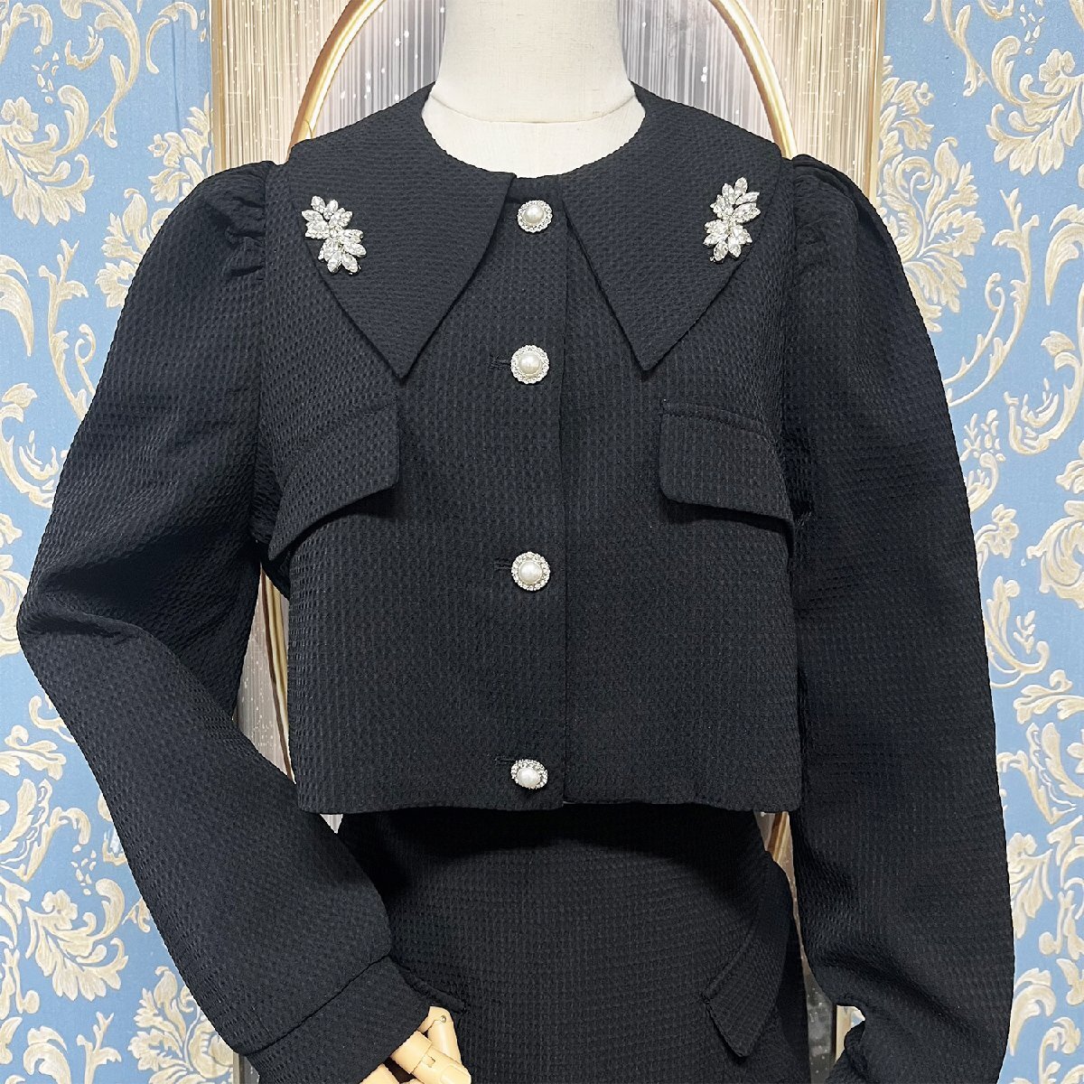 シンプルでスタイリッシュなセットアップで、女性らしい大人上品な魅力を演出しています。ジャケットの襟の飾りはキラキラしていて、上品な雰囲気を醸し出し、高級でエレガントな印象を与えます。ミニスカートなので脚長効果も期待できる。歩くたびにふわっと揺れるフレアスカートは女の子らしさたっぷり。つまり、Aラインのディザインとミニ丈の組み合せは、女の美しい姿を完璧的に表示されます。