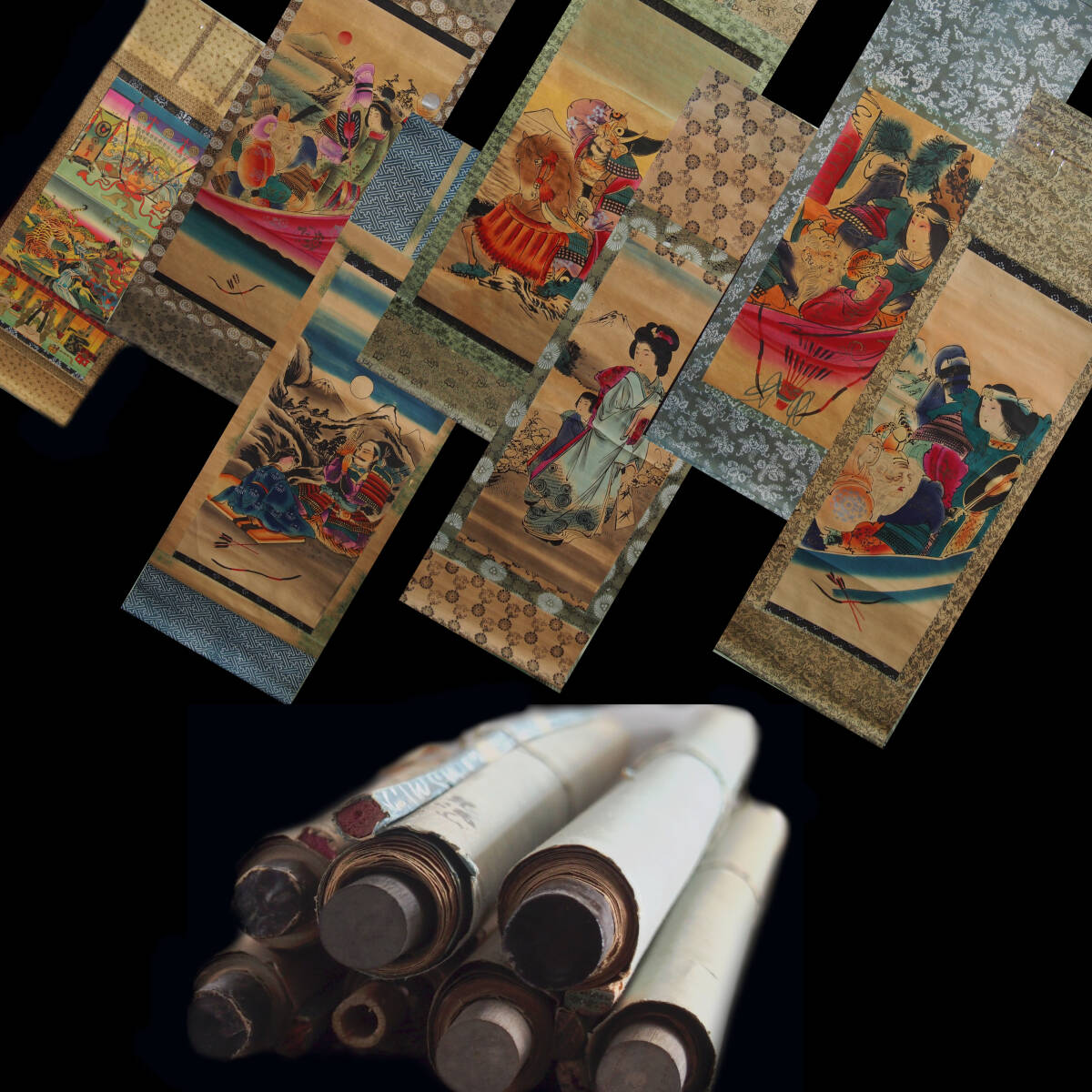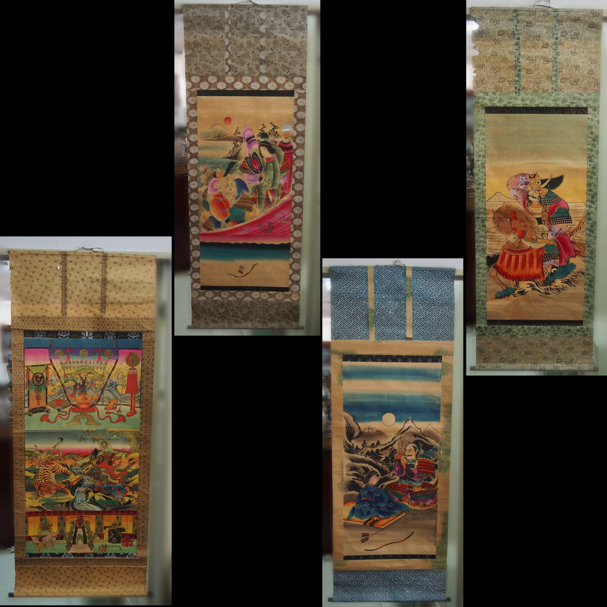 Hanging scrolls (a long, vertical scroll of painting or calligraphy that is hung on a wall) are generally displayed on the wall of alcove in a Japanese house. It is usually decorated with paintings of Japanese cultural things such as calligraphy, Samurai, woman in a Kimono, and so onIn modern Japanese culture, it is often used to welcome guests and create a formal space. These are one of the most typical paintings of hanging roll and we will recommend you buying those as a souvenir for your family or friends. *Some of the hanging scrolls are partly torn FYI*