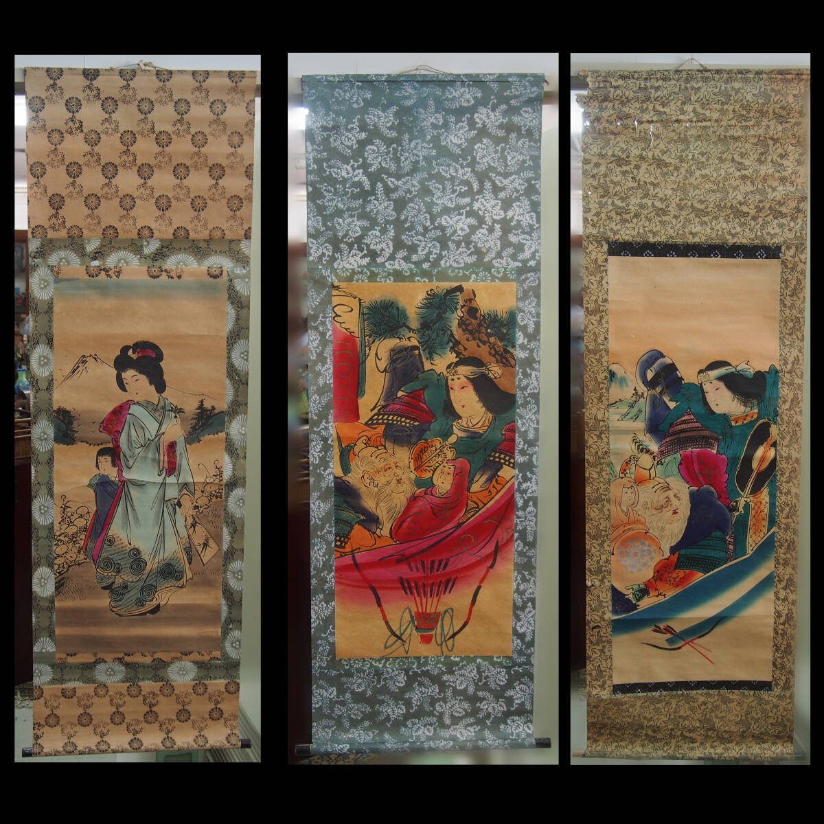 武士や着物姿の女性、富士山など日本特有の絵が描かれた掛軸7幅になります。