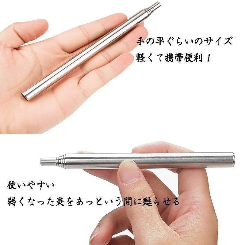 火の粉を避けられる安全の距離で 6節構造で、長さを自由に調整できます。 使用方法もやすいし、初心者でも簡単に 焚き火の点火時などピンポイントに送風し、 軽くて省スペースのサイズで、 使わない時は13cmの長さに収縮出来ます。 |