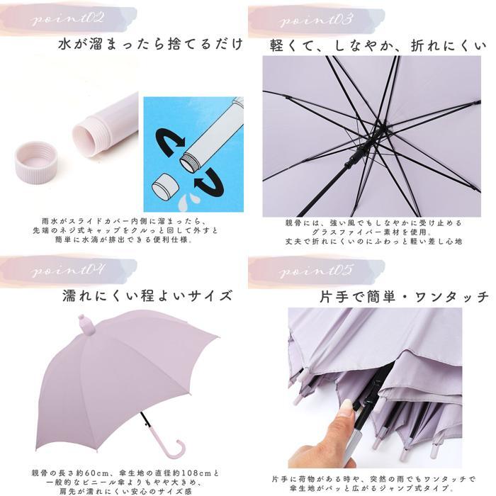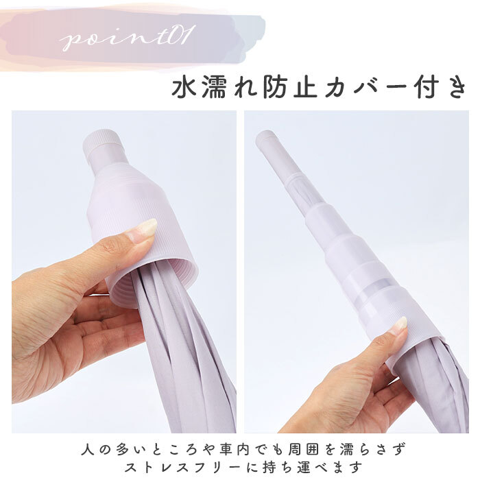 | 商品説明 | ・・混雑した場所でも洋服や周囲を濡らさない♪水濡れ防止カバー付きでストレスフリー「スライドキャップアンブレラ」が新登場! ・【濡れた傘に、サッと被せるだけ】 ・傘に触れて洋服の裾やカバンが濡れてしまったり、満員電車などで周囲の人を水滴で濡らす心配のない、伸びるカバーの付いたユニークなアンブレラ。 ・【カバーの装着はとっても簡単】 ・傘をたたんでバンドが留まっているのを確認してから、先端部分の傘カバーを、手元へ向かってぐーんとスライドさせるだけで装着が簡単♪ ・【車内に持ち込む時のエチケット】 ・キャップの底に水滴が溜まるので、傘を持って自動車に乗るときでも床を濡らす心配ナシ♪傘立てのない室内に持ち込む時にも便利。 ・【水が溜まったら捨てるだけ】 ・雨水がスライドカバー内側に溜まったら、先端のネジ式キャップをクルっと回して外すと、簡単に水滴が排出できる便利仕様。 ・【軽くて、しなやか、折れにくい】 ・親骨には、強い風でもしなやかに受け止めるグラスファイバー素材を使用。丈夫で折れにくいのにふわっと軽い差し心地。 ・【濡れにくい程よいサイズ】 ・親骨の長さ約60cm、傘生地の直径約108cmと一般的なビニール傘よりもやや大きめ、肩先が濡れにくい安心のサイズ感。 ・【片手で簡単・ワンタッチ】 ・片手に荷物がある時や、突然の雨でもワンタッチで傘生地がパッと広がるジャンプ式タイプ。 ・【たたむ時も手間取らない!】 ・留めバンドには、傘生地がサッとまとめやすい面ファスナーバンドを採用。「Rd.Rainbow Drop」のロゴパッチがさりげないワンポイント。 ・【気持ち華やぐ大人カラー】 ・ふんわり優しいくすみカラーや、傘の波の中でも個性が際立つバイカラー・ボタニカルデザインなどバラエティ豊富にラインナップ。シンプルなデザインが、全ての世代の女性のファッションに素敵にフィット。 |