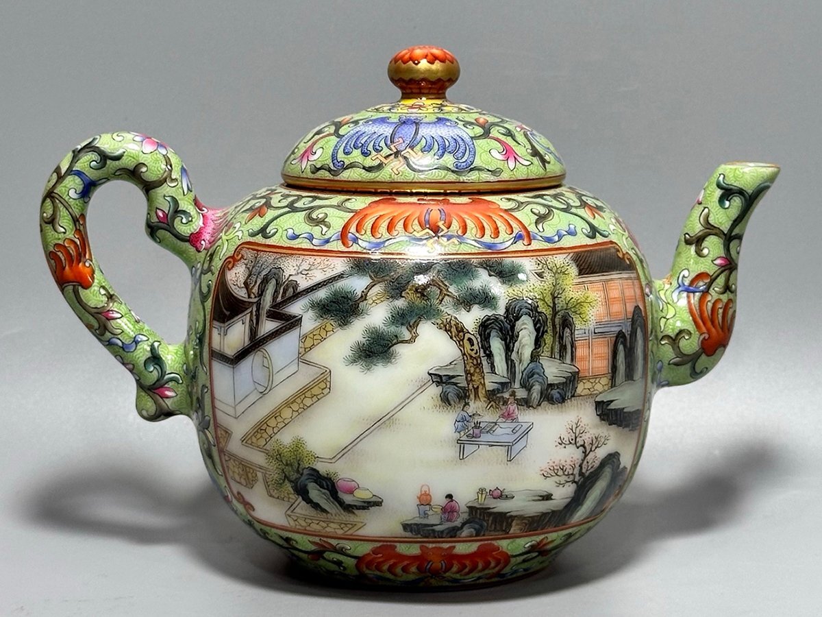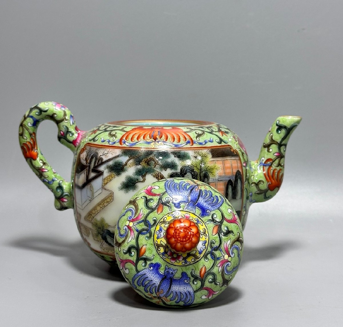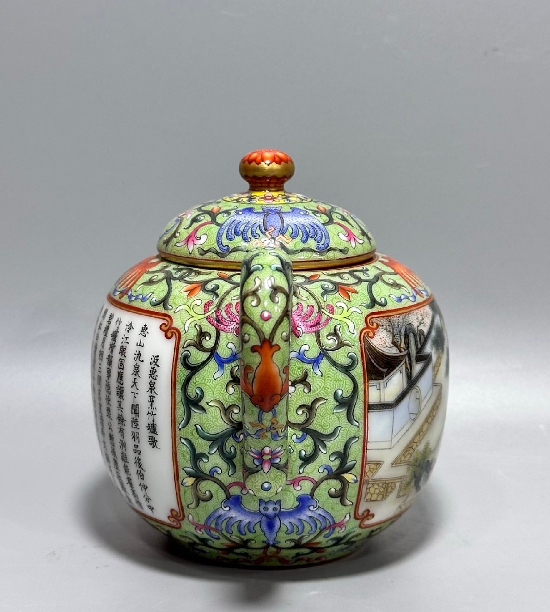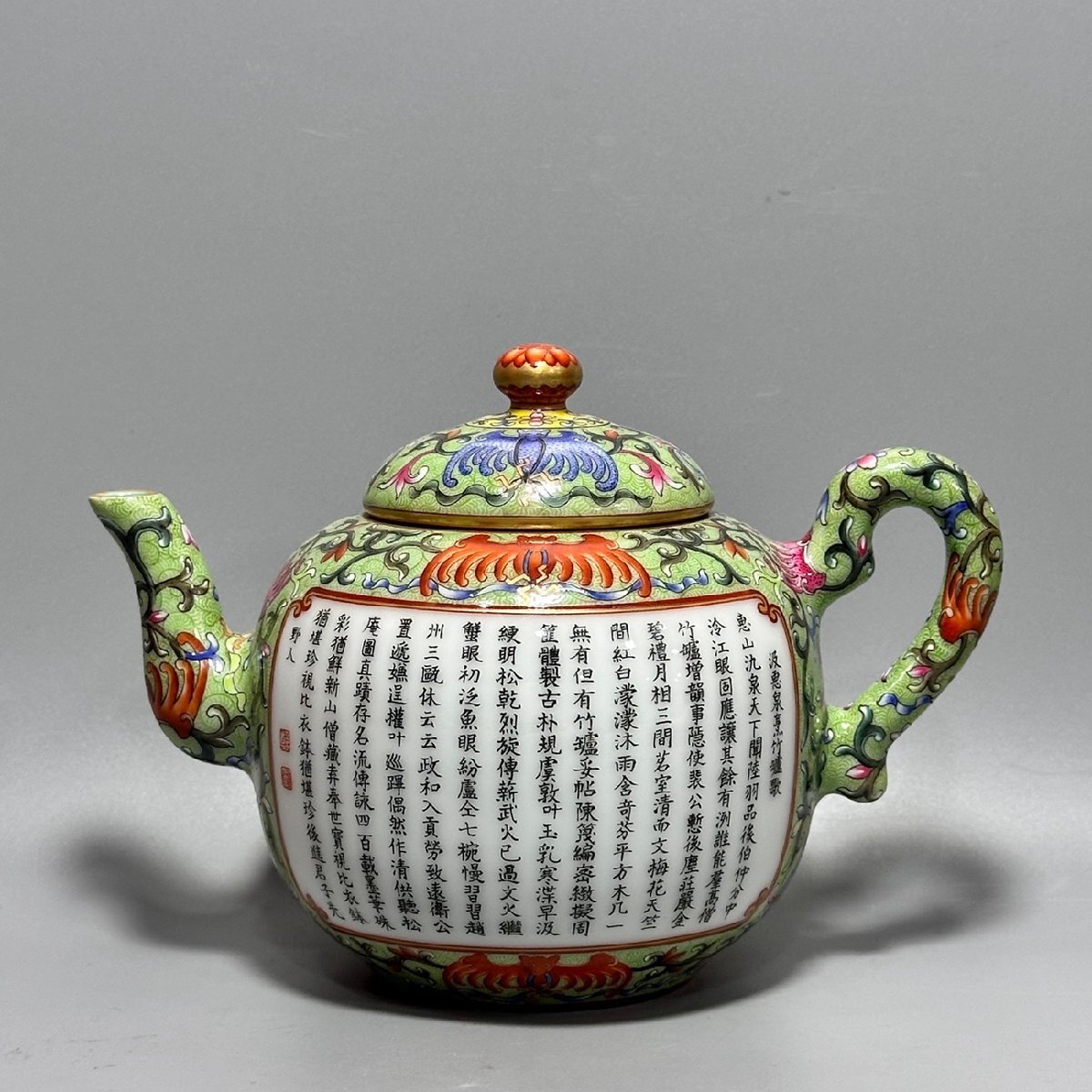 【安】清時代 大清乾隆年製 琺瑯彩鳳尾草鳳穿纏枝漢詩紋開光人物図茶壺 唐瓷 古陶瓷 中国古美術 古董品 304 サイズ(約寸) |