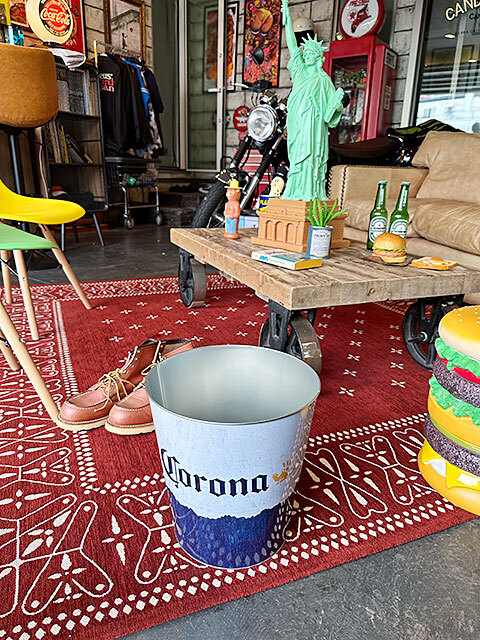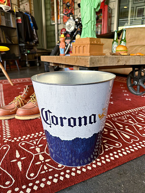 コロナの伝統のロゴマークが描かれたブリキ製ゴミ箱です。