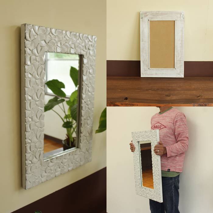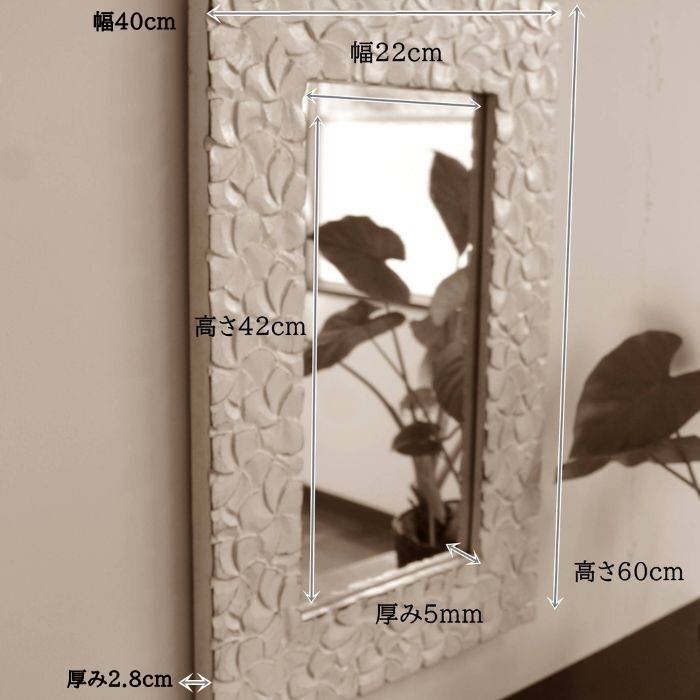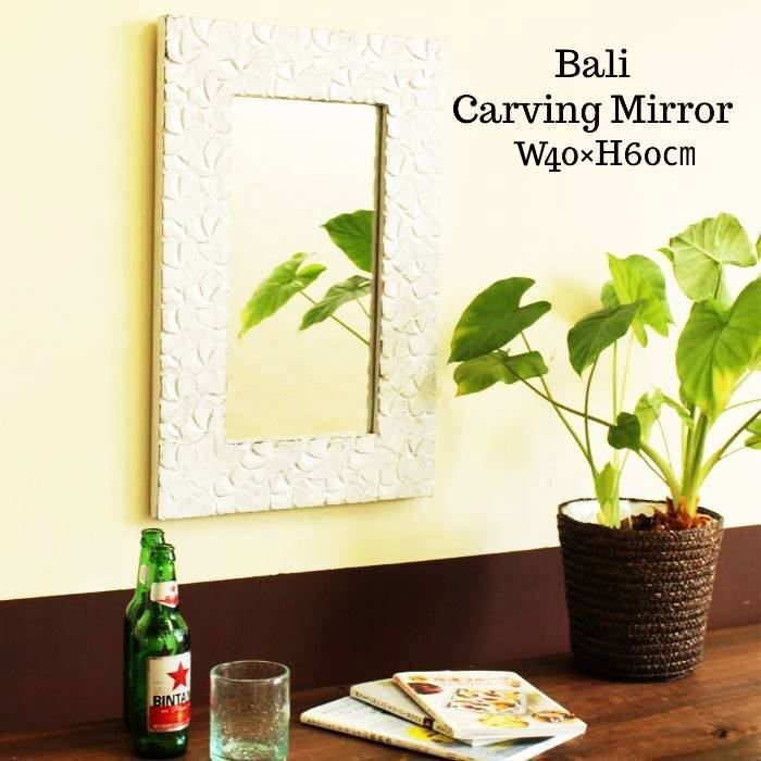 プルメリア 木彫りフレーム ミラー ホワイト W40xH60cm WOO-0527 鏡 壁掛け鏡 木製 木 ウッド 彫刻 カービング アジアン アジアン雑貨
