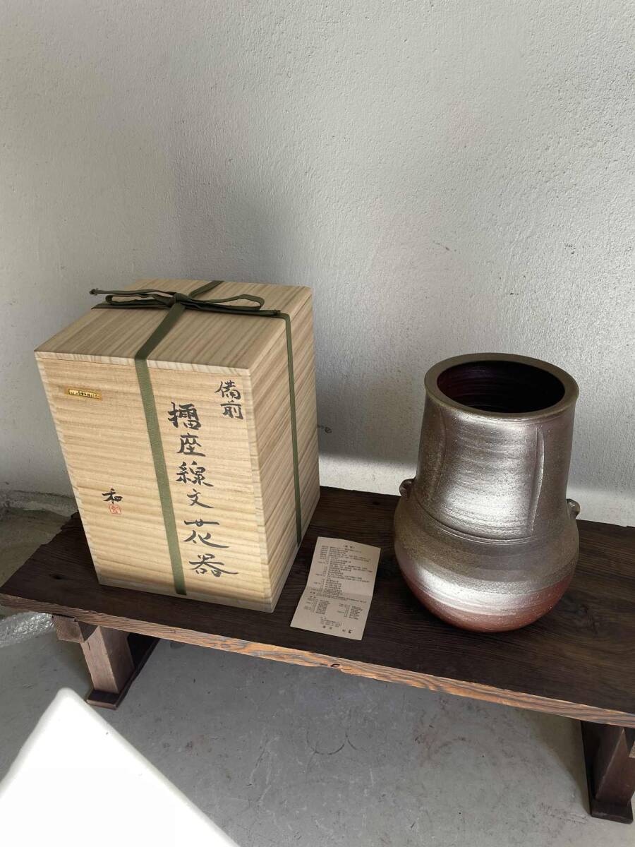 ◆人間国宝◆本物保証◆藤原和・藤原雄師事◆擂座線文花器◆備前焼締◆デパート購入未使用◆ 検>藤原啓 花器花活花瓶 茶道具