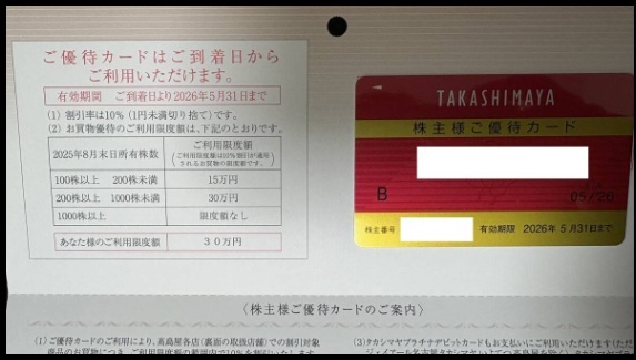 ■高島屋株主優待10%割引カード 男性名義です。限度額は30万円です。