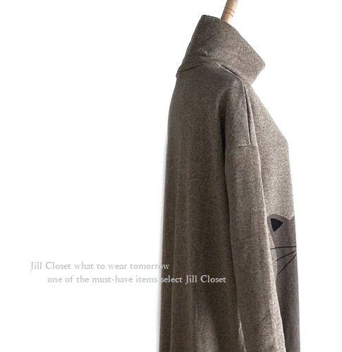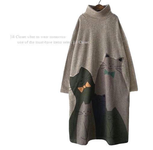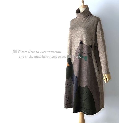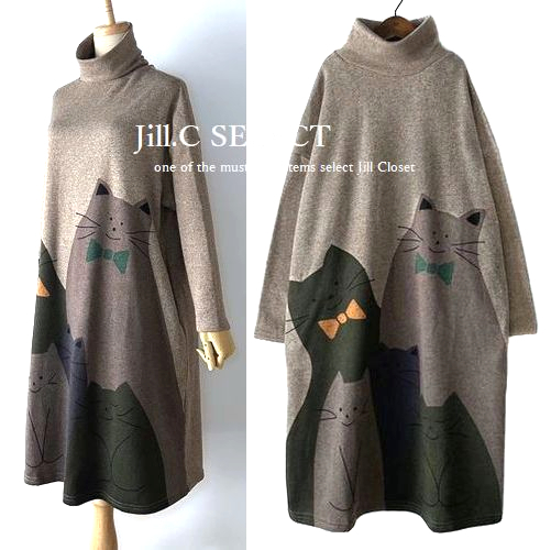 新品【送料185円】伸縮◎遊び心溢れる♪可愛い猫ちゃんプリント*ほっこり暖かい裏薄起毛 プルオーバー*チュニック*ワンピース7741.BEIGE