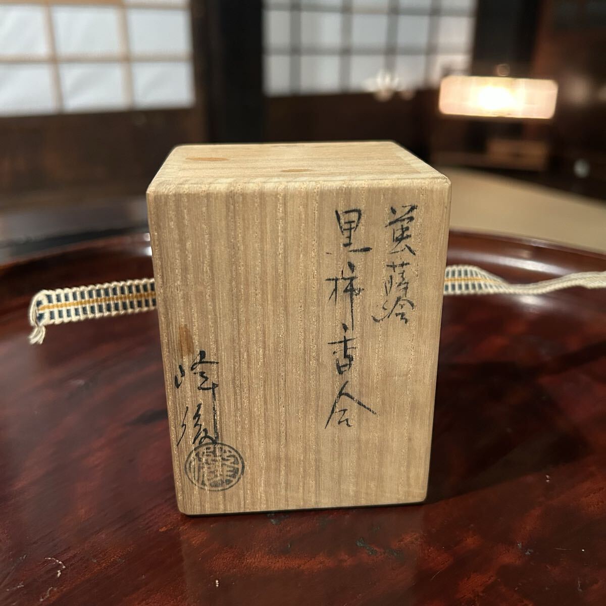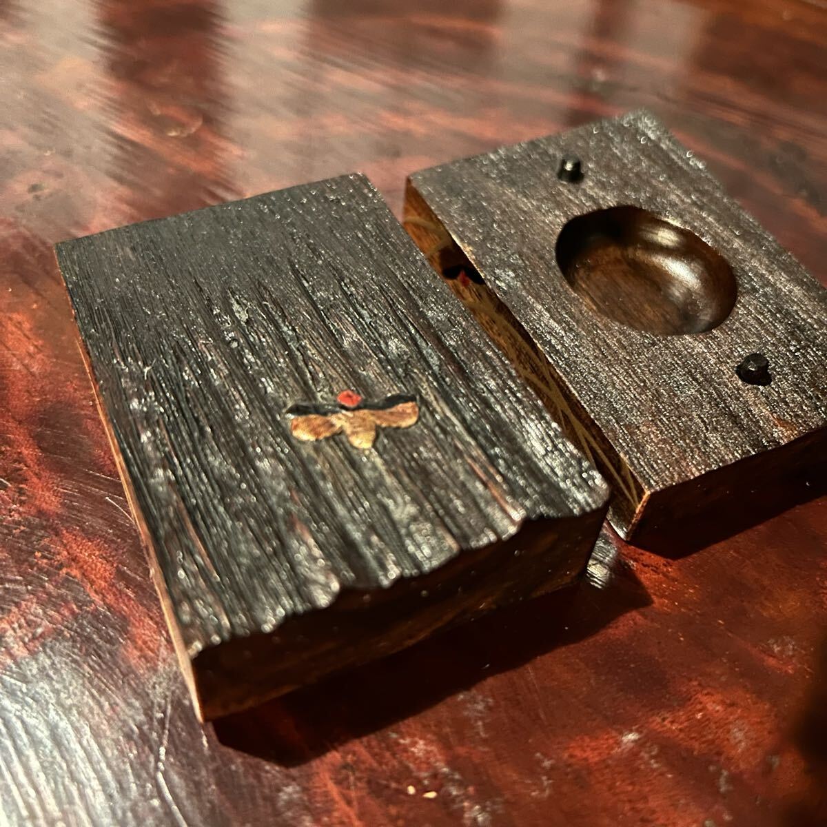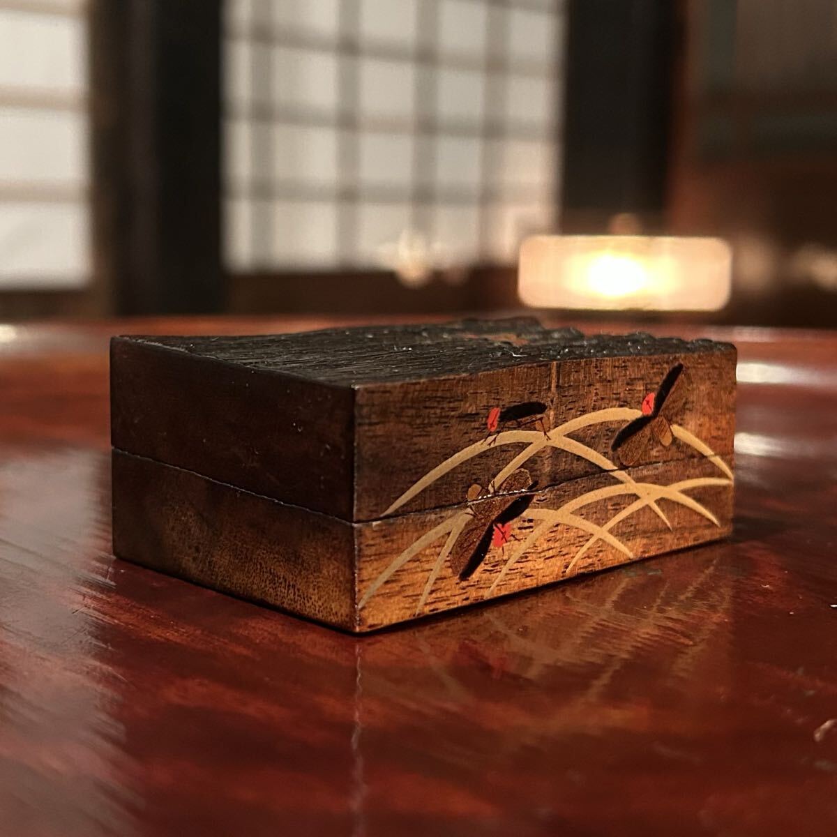黒柿特有の深く表情豊かな木目に、黄金の草木と赤い頭部は源氏蛍でしょうか、赤が素晴らしく映える上品な意匠。繊細な蒔絵が、静かな古民家の灯りに浮かび上がるように輝きます。日本の美を凝縮した、非常に格調高い黒柿香合です。