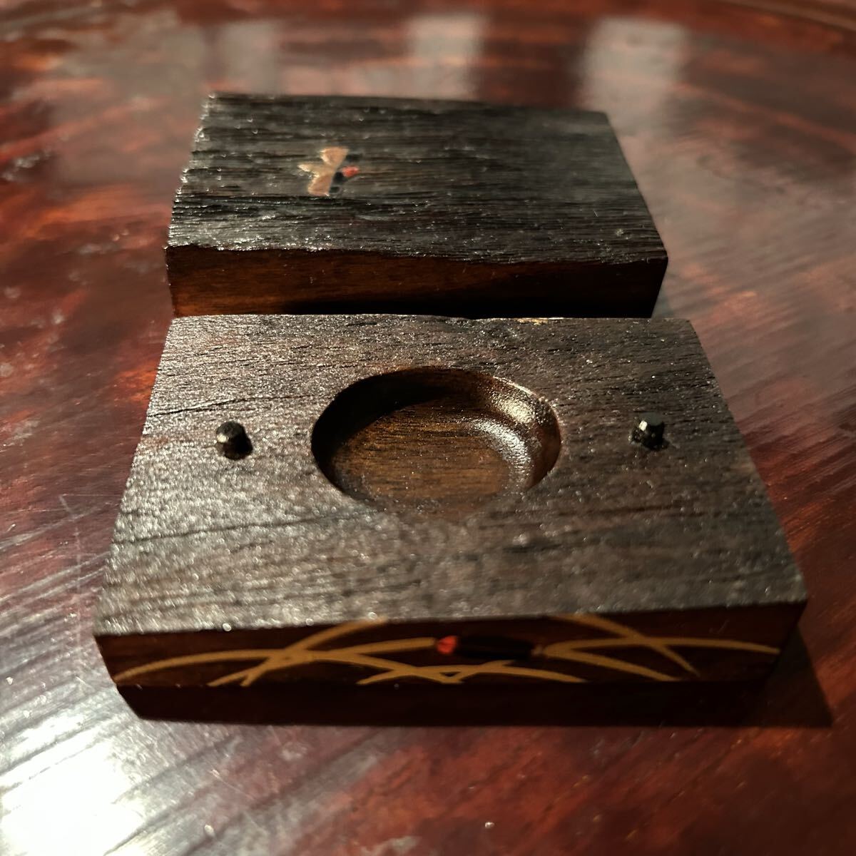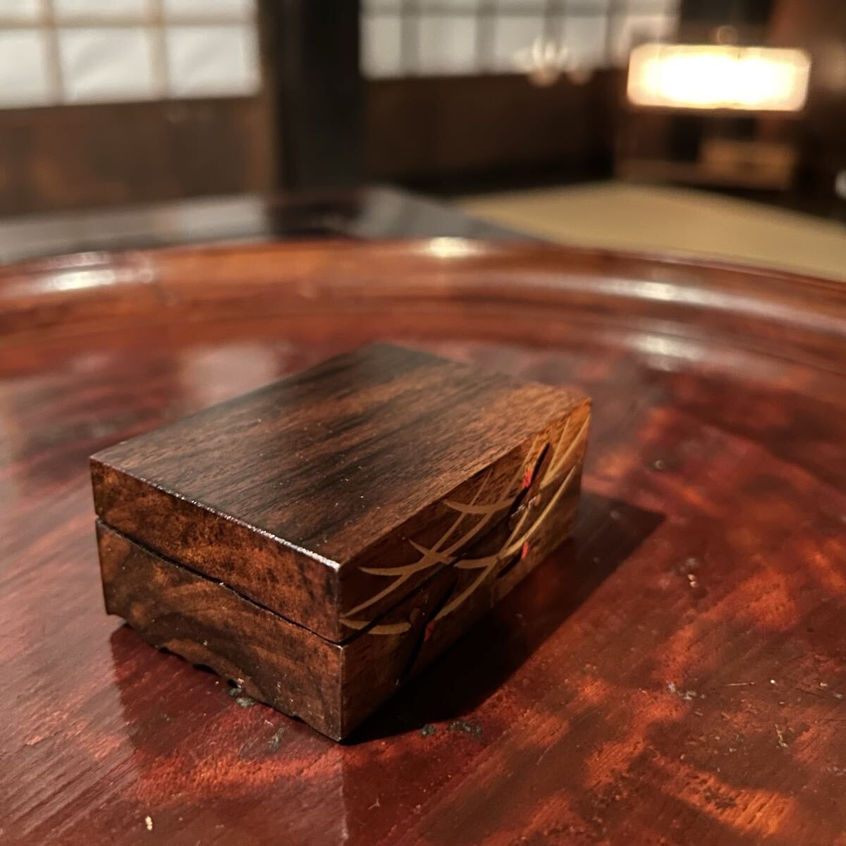 大きな傷や欠けは確認できません。黒柿特有の杢や経年の艶が美しく、使用感の少ない良好な状態です。また、蓋の上部と、下側の底面で同じ木とは思えない表情の違いを演出している点はなんとも心ニクいところです。