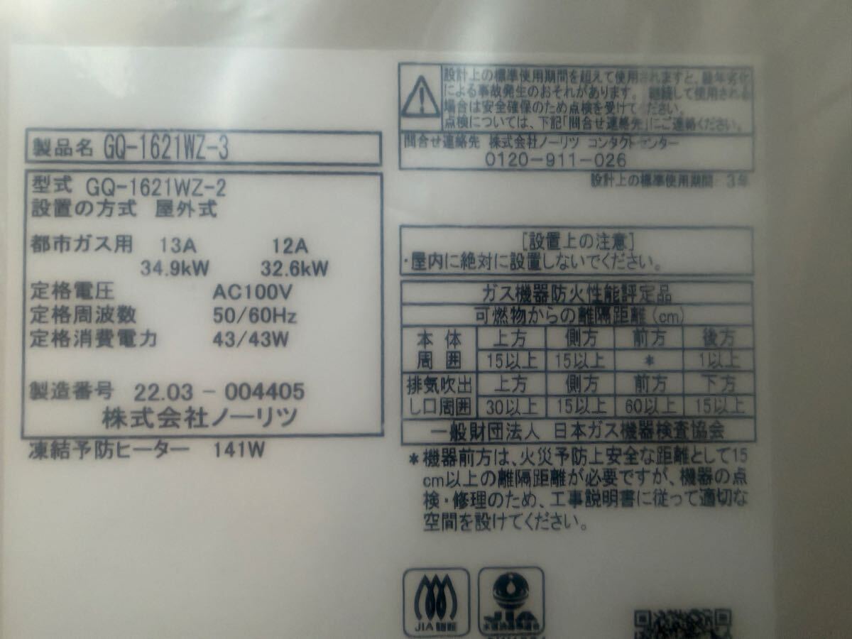 ノーリツの都市ガス用給湯器GQ-1621WZ -2 -3 です。
