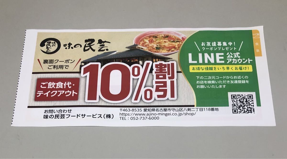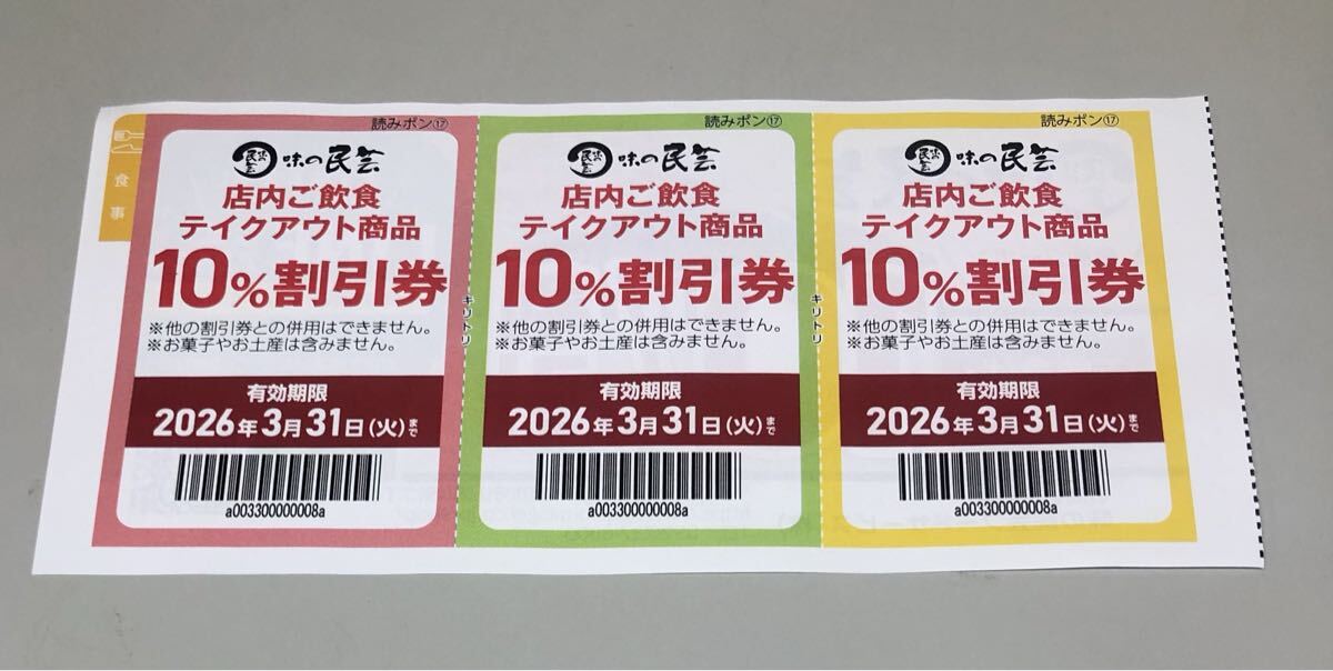 味の民芸 店内飲食・テイクアウト 10%OFF 割引券 3回分