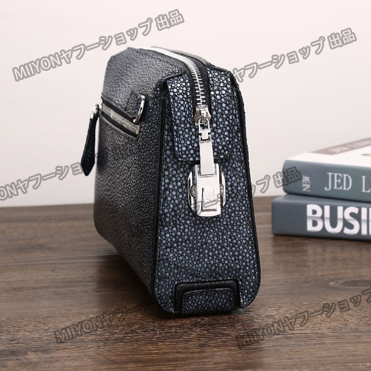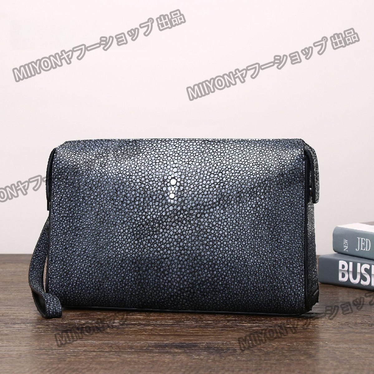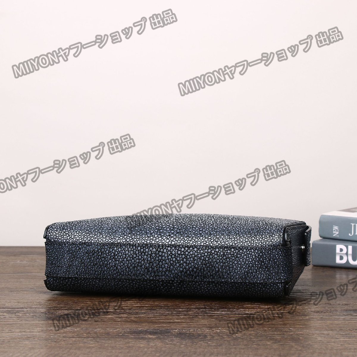 ★状態:新品未使用 商品状態:新品・未使用品 ●エイ革の特徴 エイ革は、古来よりその美しさから「泳ぐ宝石」と呼ばれて高級な皮革素材として珍重されています。 「リン酸カルシウム」から成る小さい粒状の楯鱗に被われています。 非常に硬くて光沢感があり、まるで、ガラスビーズを一面に敷き詰めたような細かい突起が特徴的な革です。 エイ革の中心、1枚に1ヵ所だけスターマークと呼ばれる大きな石が付いています。一匹のエイから1つしか取れない「スターマーク」は大変貴重で、中国では古くから「天眼」「神の目」と呼ばれています。 ●商品状態:新品未使用 ●素材: 外側:エイ革 内側:牛革 ●カラー:ブラック ●付属品:ストラップ ●サイズ:26×16×7cm ※こちらの商品は、独自の方法により採寸しています。 商品によって若干の誤差が発生してしまう場合があります。