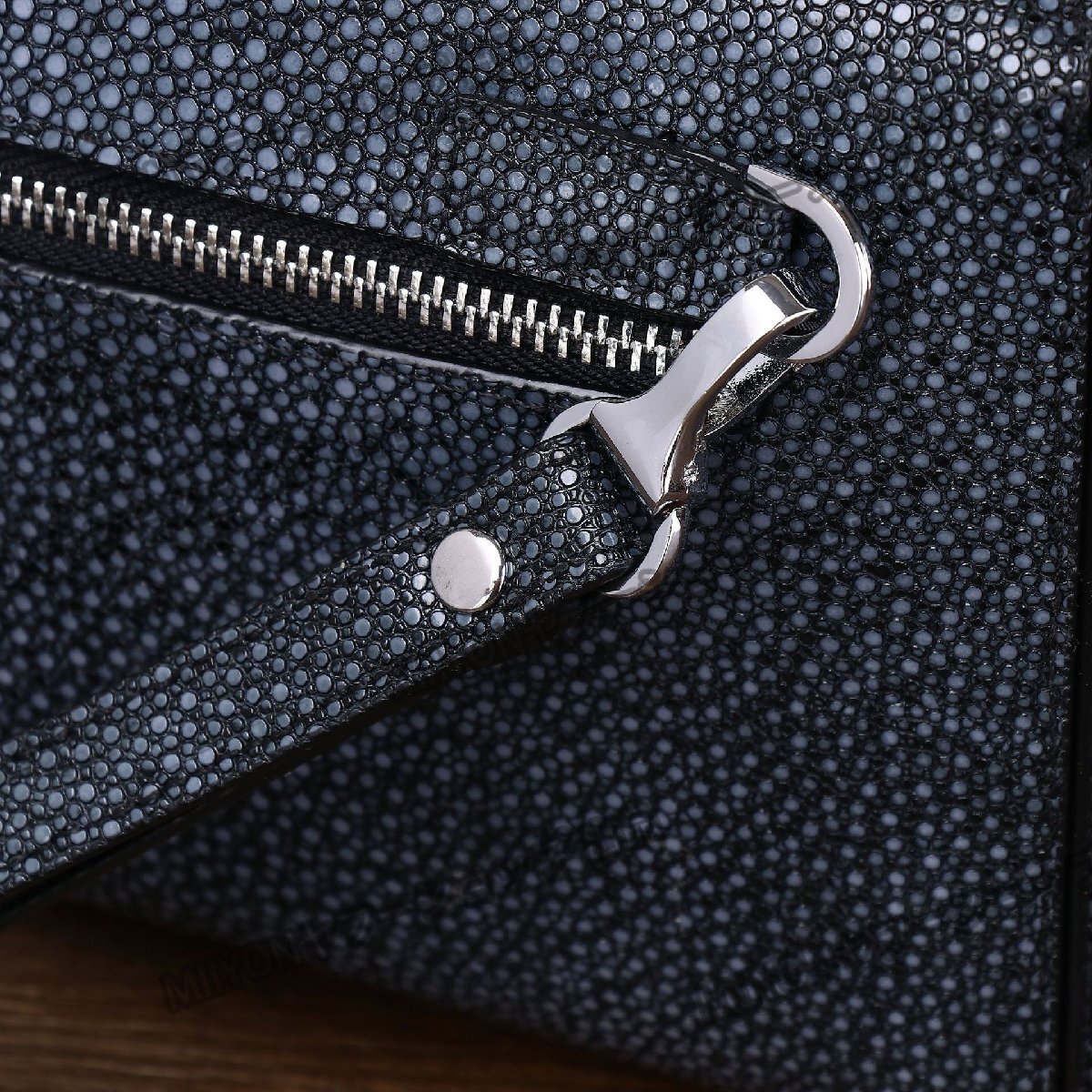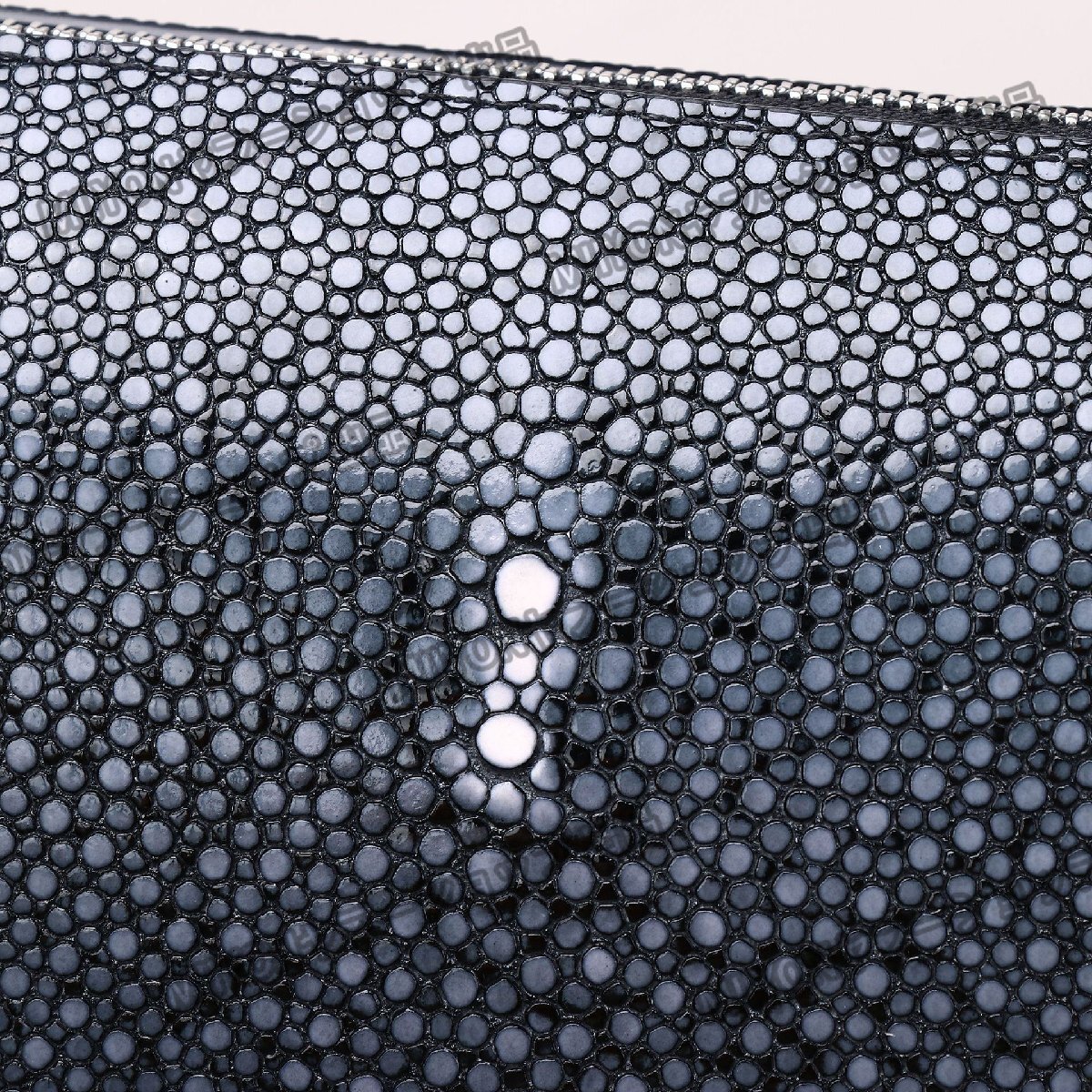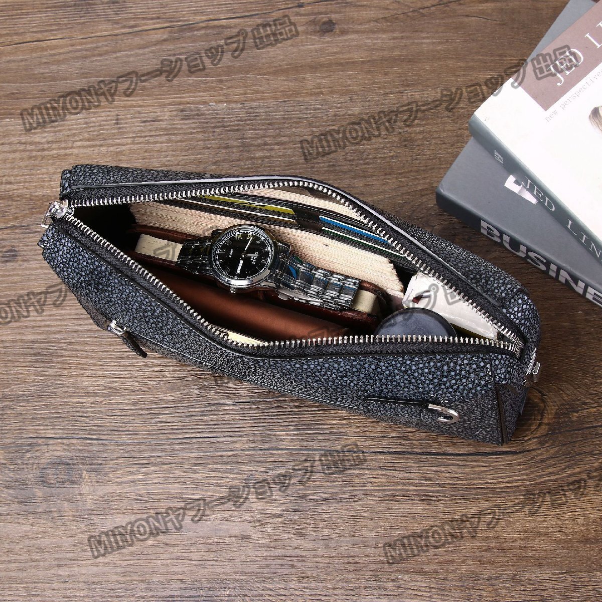 ★状態:新品未使用 商品状態:新品・未使用品 ●エイ革の特徴 エイ革は、古来よりその美しさから「泳ぐ宝石」と呼ばれて高級な皮革素材として珍重されています。 「リン酸カルシウム」から成る小さい粒状の楯鱗に被われています。 非常に硬くて光沢感があり、まるで、ガラスビーズを一面に敷き詰めたような細かい突起が特徴的な革です。 エイ革の中心、1枚に1ヵ所だけスターマークと呼ばれる大きな石が付いています。一匹のエイから1つしか取れない「スターマーク」は大変貴重で、中国では古くから「天眼」「神の目」と呼ばれています。 ●商品状態:新品未使用 ●素材: 外側:エイ革 内側:牛革 ●カラー:ブラック ●付属品:ストラップ ●サイズ:26×16×7cm ※こちらの商品は、独自の方法により採寸しています。 商品によって若干の誤差が発生してしまう場合があります。