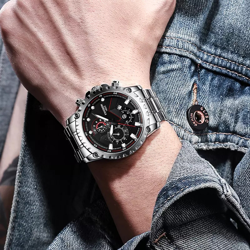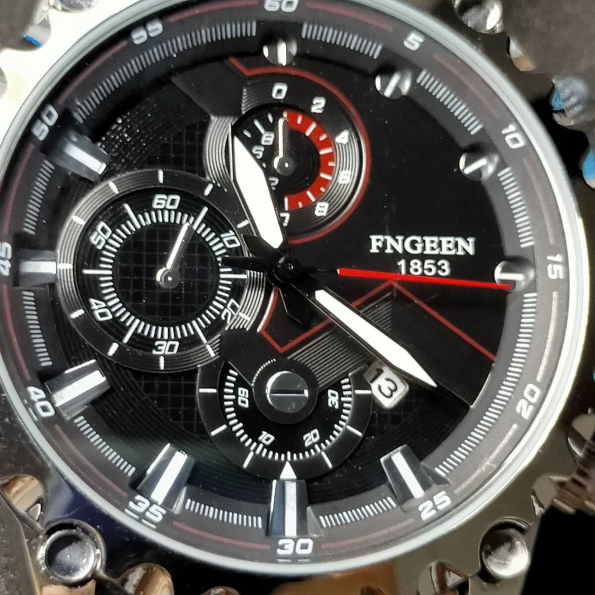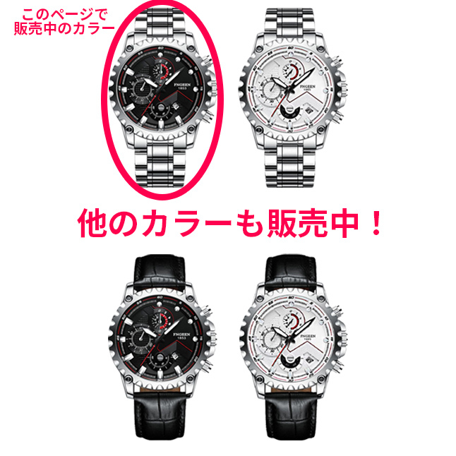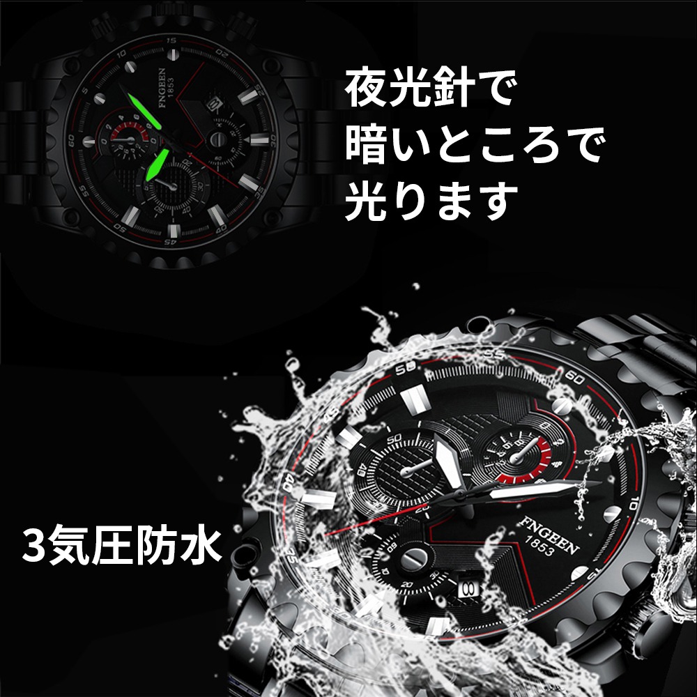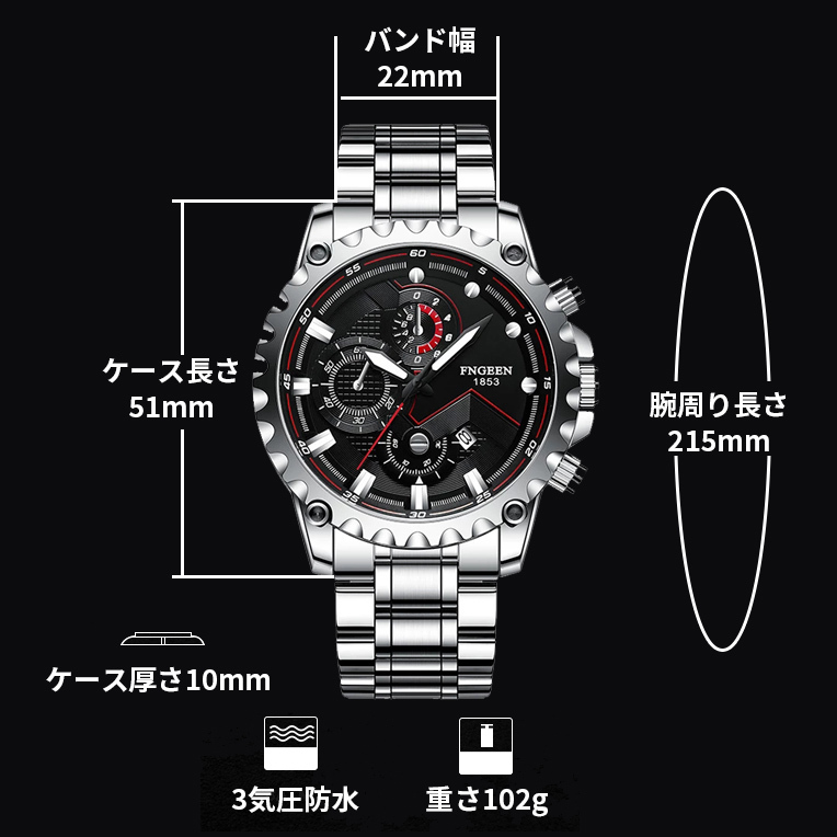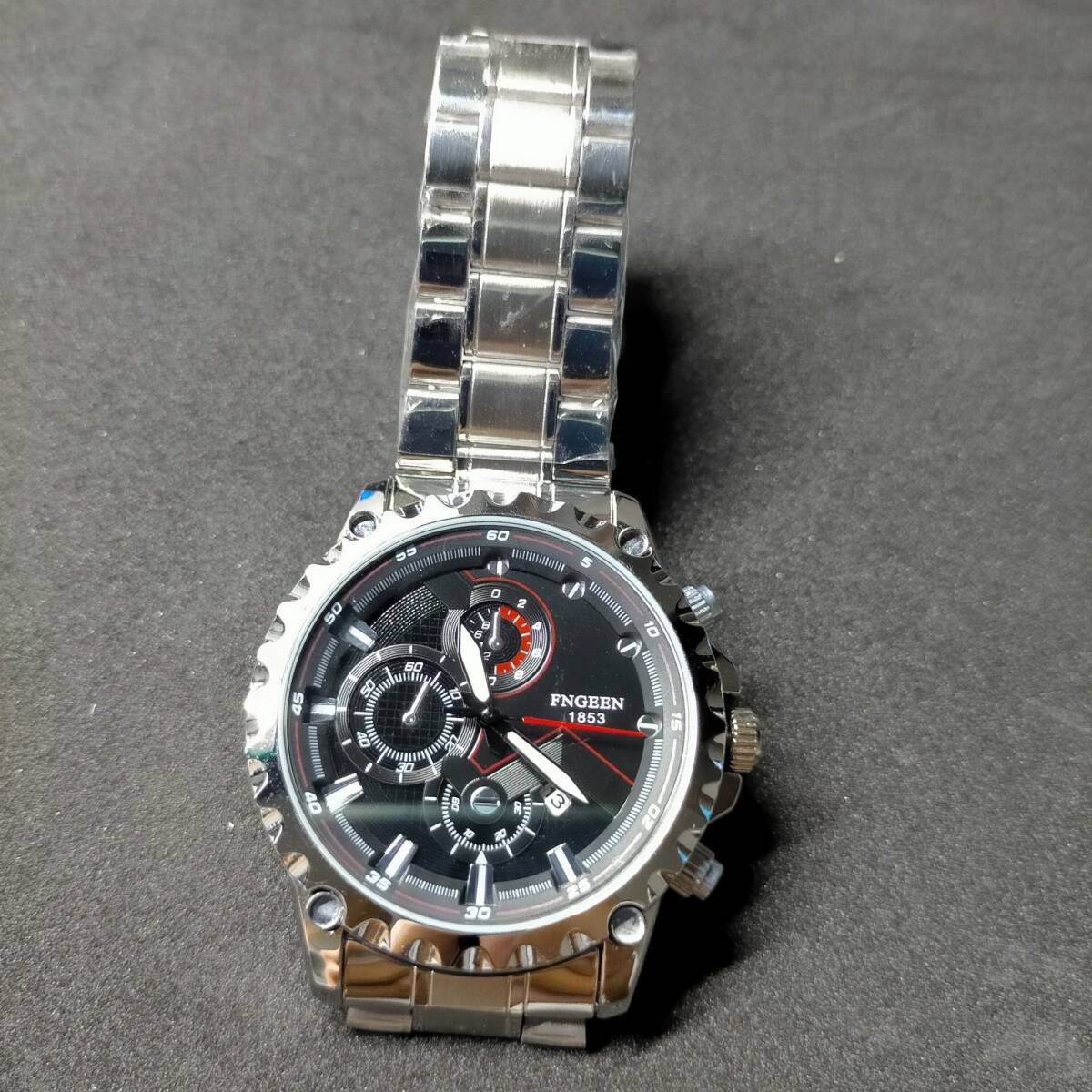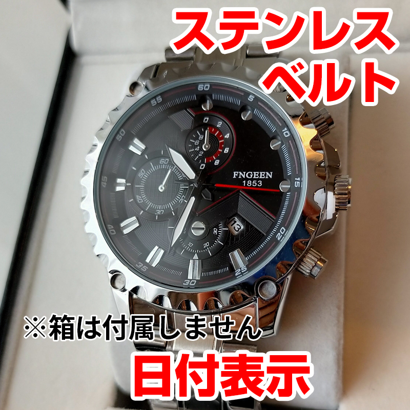 FNGEEN社 新品アナログ腕時計 防水日付カレンダー スポーツ ビジネス カジュアル ステンレスシルバー銀 ブラック黒