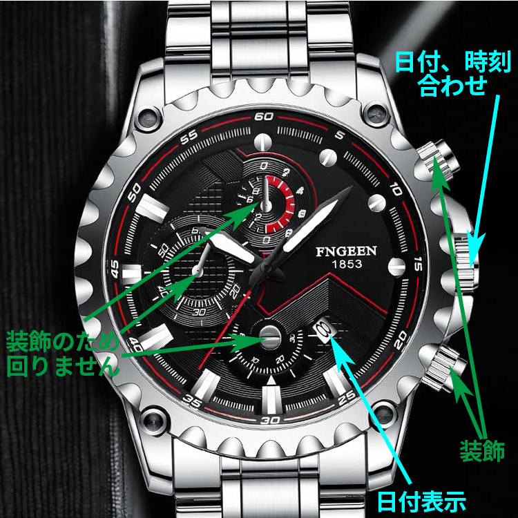※3つの小針は、飾りになります。時針、分針、秒針、日付は動作します。