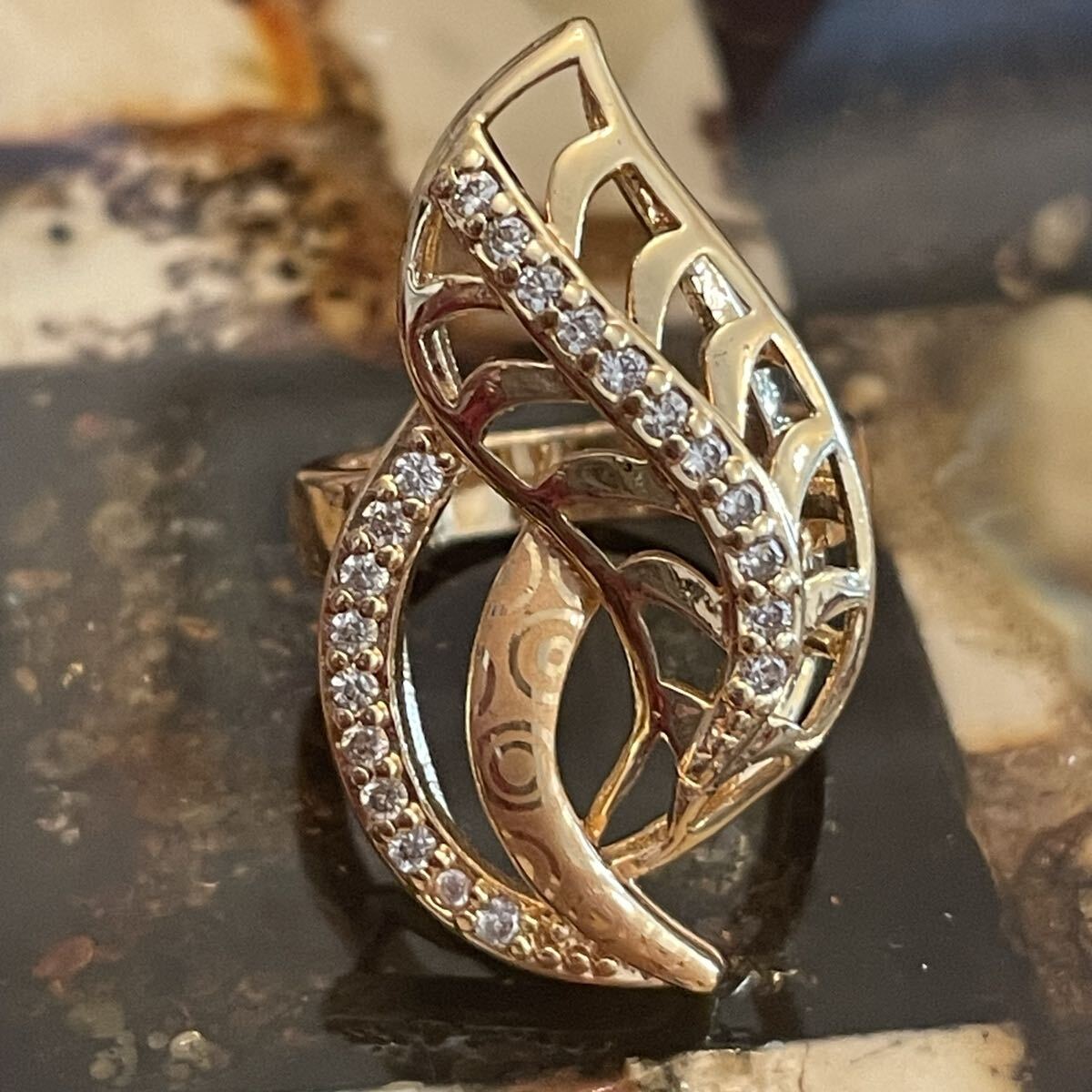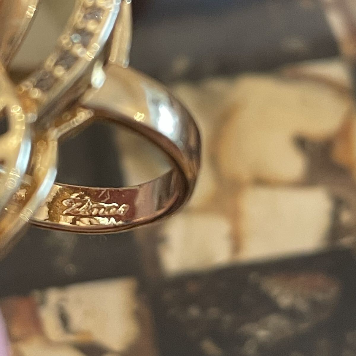 金属部分は素材不明。刻印は読み取れません。石はラインストーン。日本サイズで9号です。