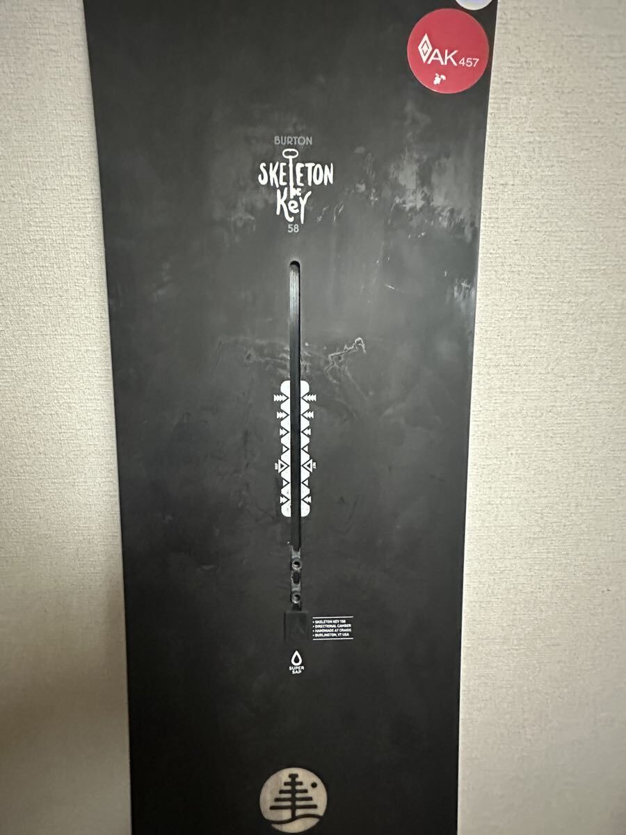 burtonのスケルトンキー158になります。backyard projectのモデルとして販売され、バーリントンのクレイグスで作られたmade in USAです。気に入って、購入シーズンと翌年に10回位使用しました。トップシートにビンディングの跡がありますが、それ以外は大きな傷もなくまだまだ使用できます。