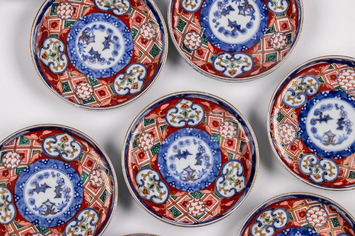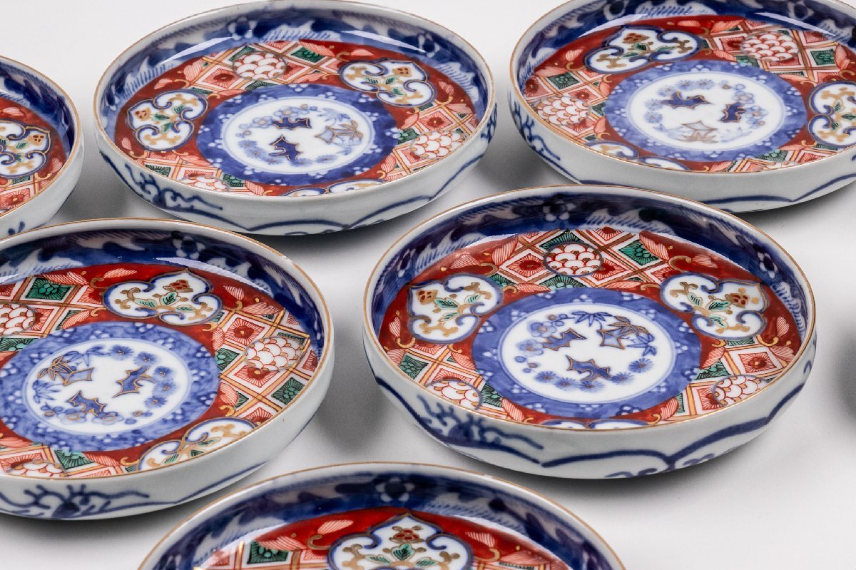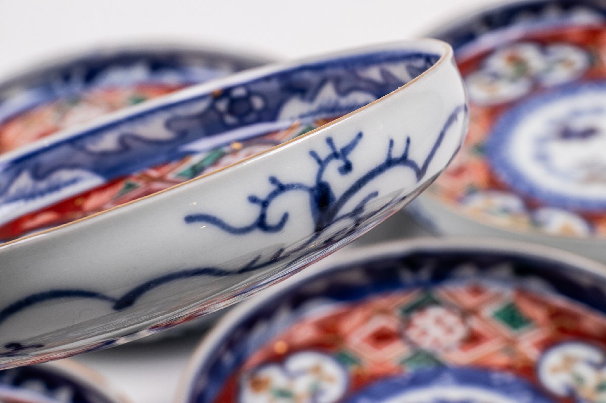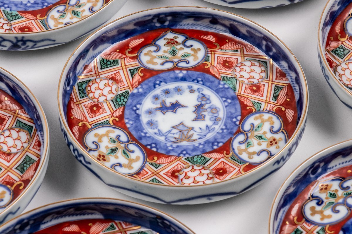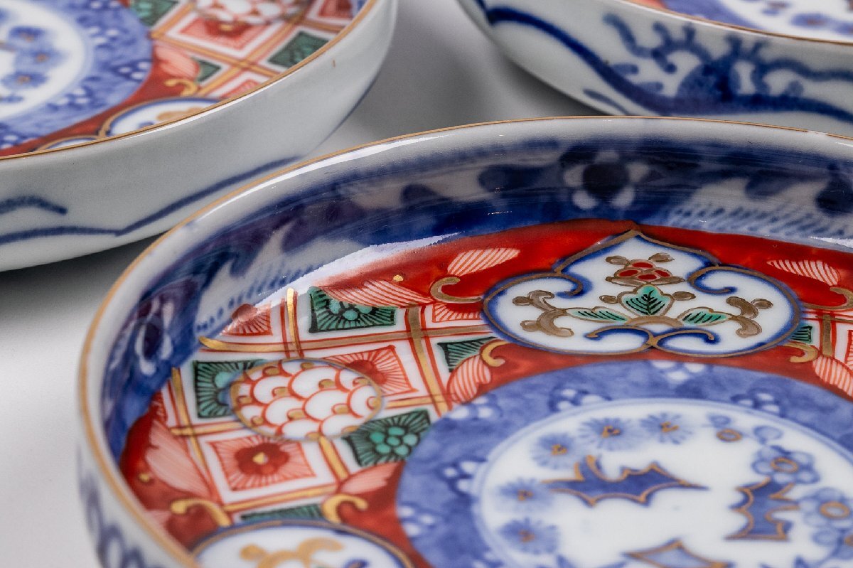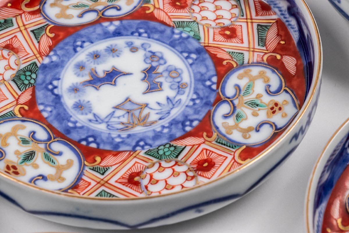 【うつわ】 大聖寺伊万里 金襴手更紗三友文四寸皿 4客 明治時代 E1242B バラ売り可能です 古美術 骨董 古玩 唐物 日本料理 懐石 料亭