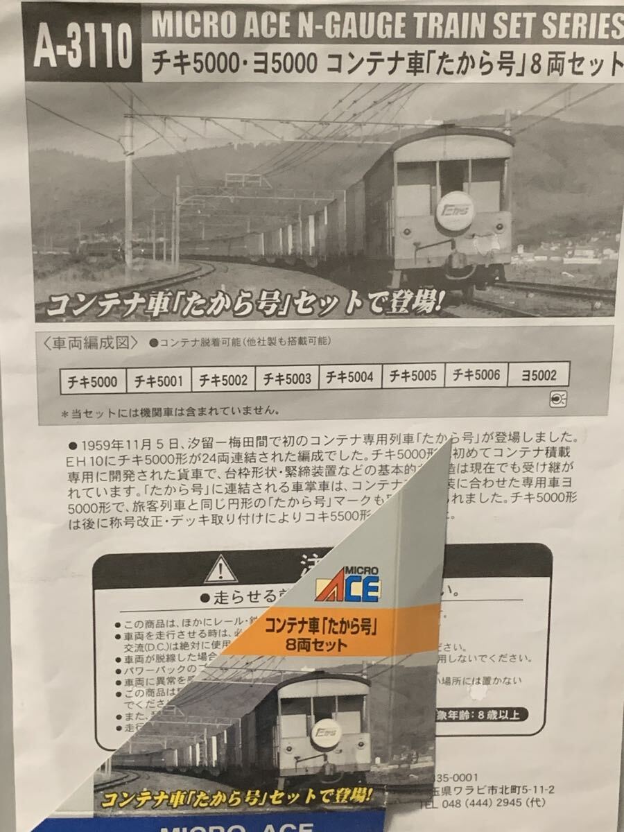 【商品名称】: マイクロエース製たから号コンテナ車(チキ5000形、ヨ5000形 13両編成、品番A-3110)