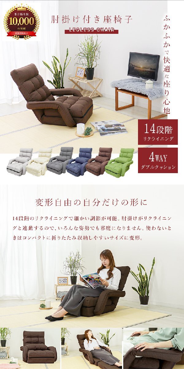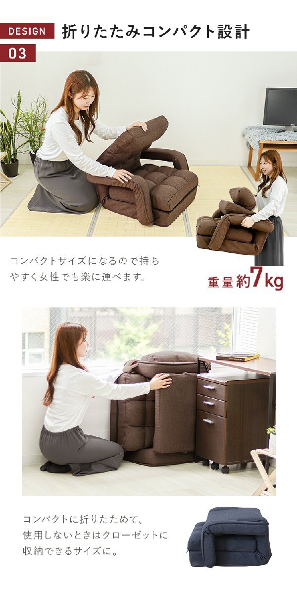 肘掛け付きで体に優しくフィットし、背もたれは14段階の角度調節が可能となっており 背もたれを倒して座面を広げてフルフラットな状態にするとソファーベッドにもなります★ 16個のコイルが体圧を上手に分散し、体への負担を軽減してくれます。 大事な内部ギアは、世界でも活躍する実績ある日本メーカー「KoYo」の日本製! 折り畳み可能で、収納や持ち運びがとても便利です。 通気性の良いファブリック素材なので1年中お使い頂けます! 【商品仕様】 カラー:アイボリー 外寸サイズ:(約)幅68x奥行68x高さ70cm フラット時(ベッド)サイズ:(約)165cm 座面厚み:(約)最大24cm 収納時サイズ:(約)幅68x奥行57x高さ32cm 重量:(約)7kg 素材:麻リネン布、ウレタンスポンジ、鋼管 【注意事項】 ・この商品はカバーリングではありません。(洗濯不可) ・生産ロッドが違う場合、柄/色味が若干変わってくる場合がございます。 ・商品を使用して発生した事故/トラブル/破損等につきましては一切の責任を負いかねます。 |