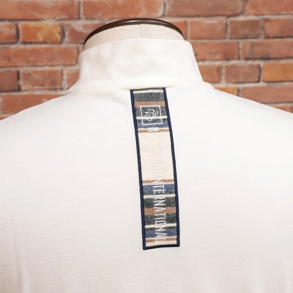 ネックとバックにあしらわれたチェック柄のロゴワッペンが、シンプルな中にも上品な遊び心を感じさせる半袖モックネック。落ち着いたデザインながら、さりげなく個性を演出できる一枚です。